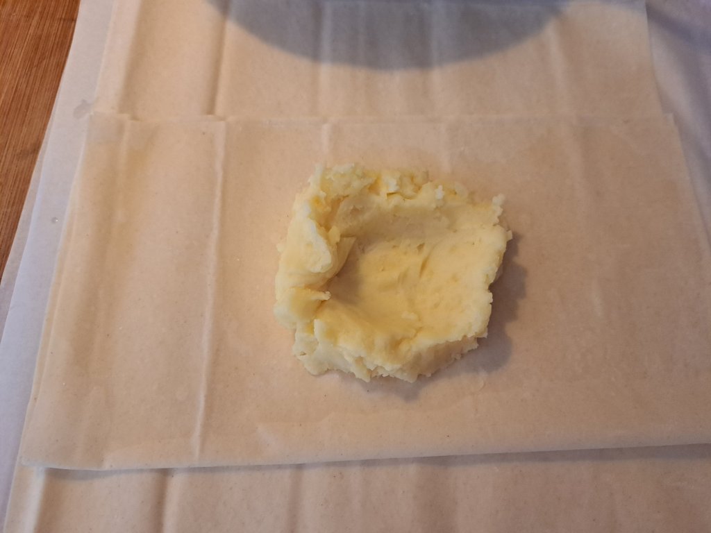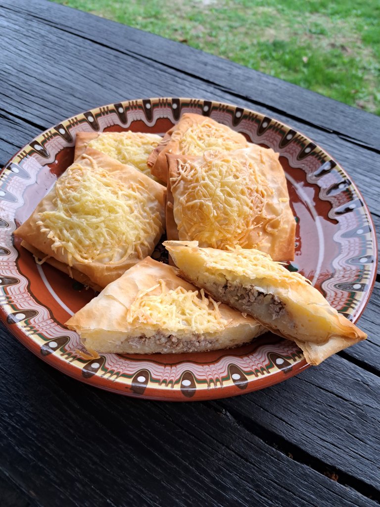 Винаги можем да разнообразим баничката. Днес Ви предллагам една малко позната рецепта за банички с готови кори, картофено пюре и кайма.