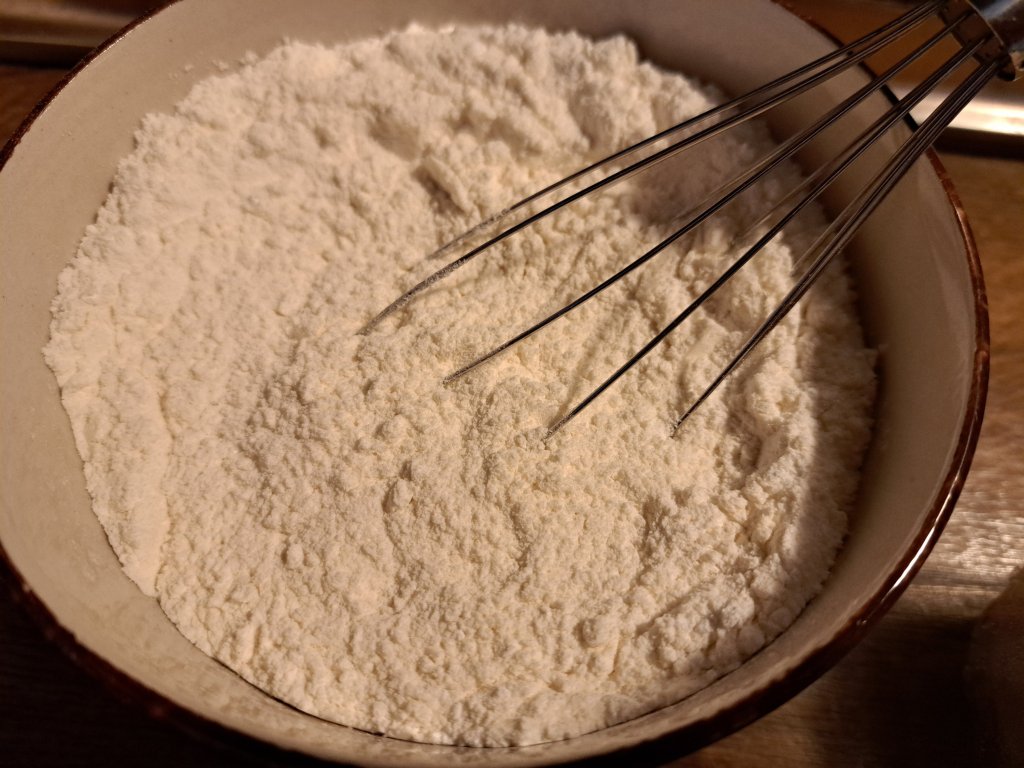 Смесвам брашното със солта и бакпулвера.
