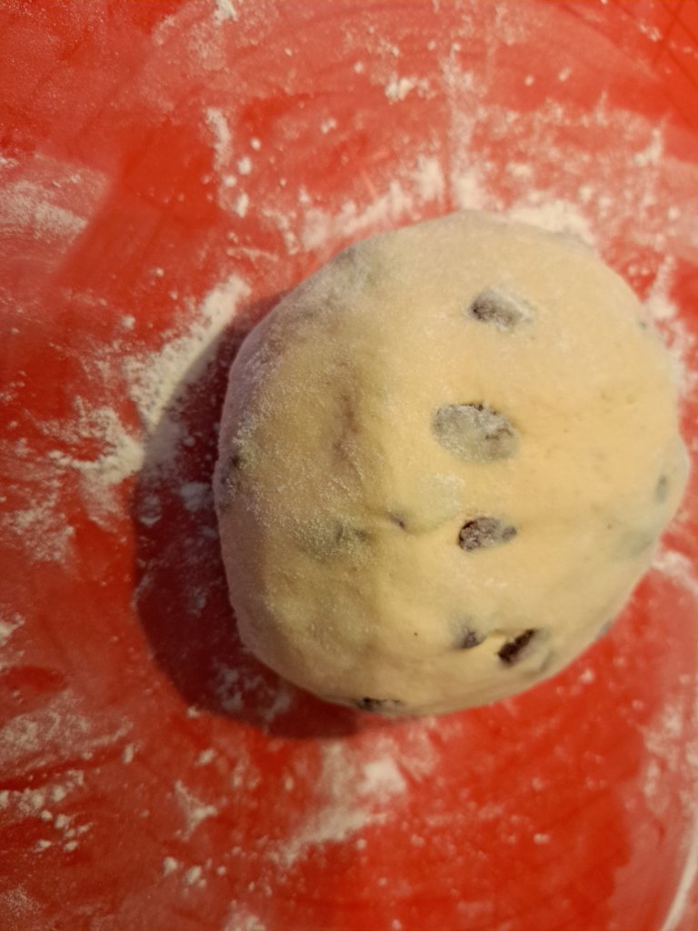 Изваждам тестото на поръсена с брашно повърхност, добавям стафидите и доомесвам.