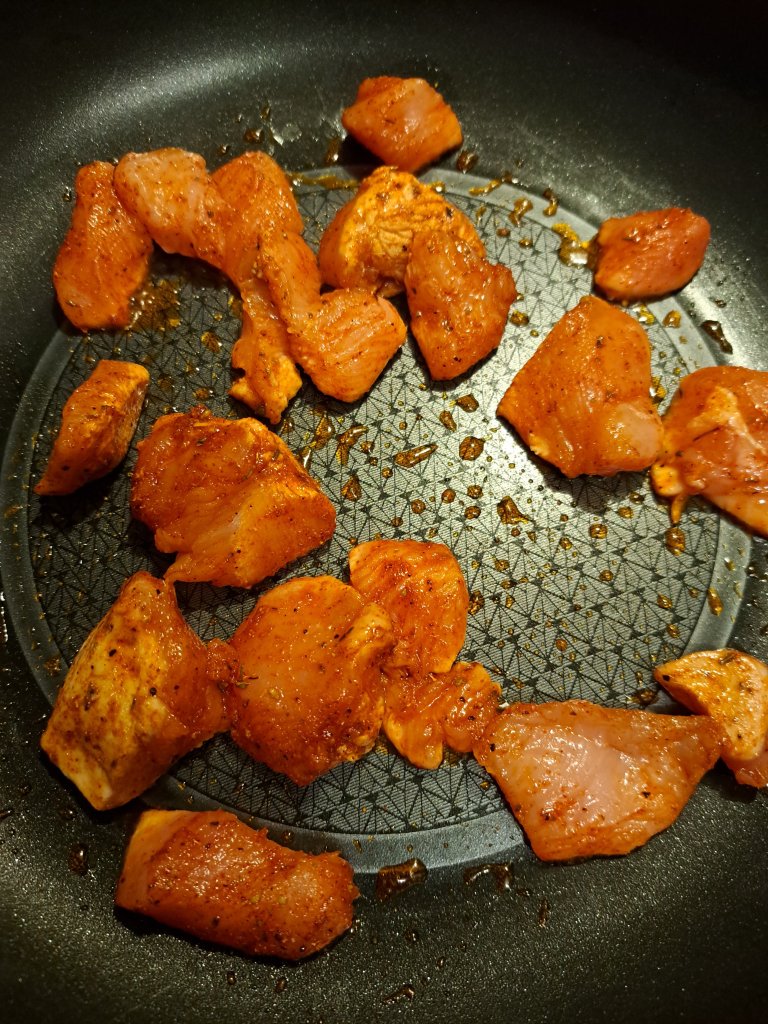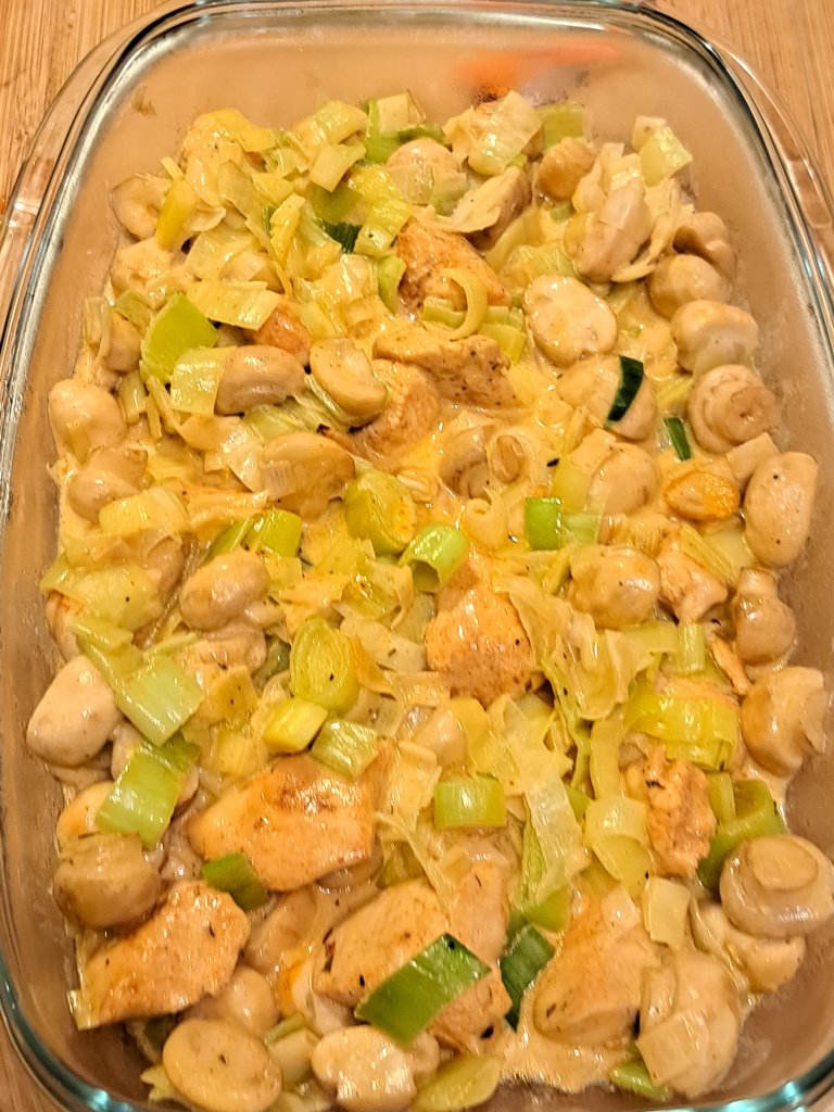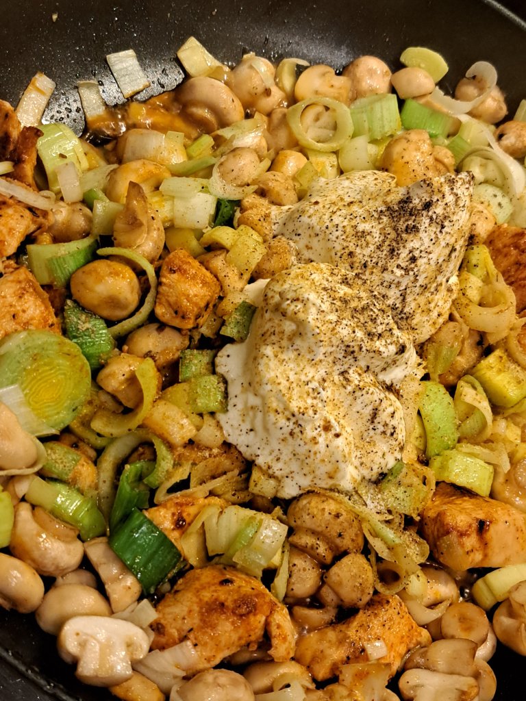 Подправено пилешко месо, праз лук и хрупкави малки гъбки се изпържват и накрая с крем фреш се доовкусяват.