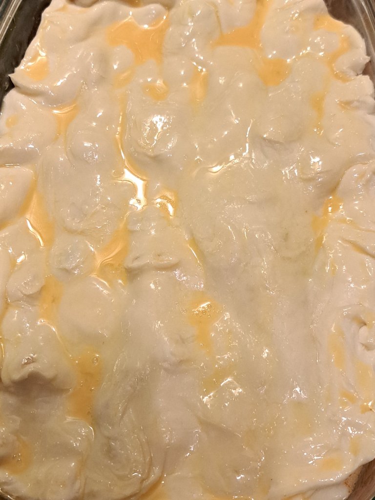Покривам тавичката с тестото и притискам. Аз бързах и не декорирах, но по желание може да декорирате.