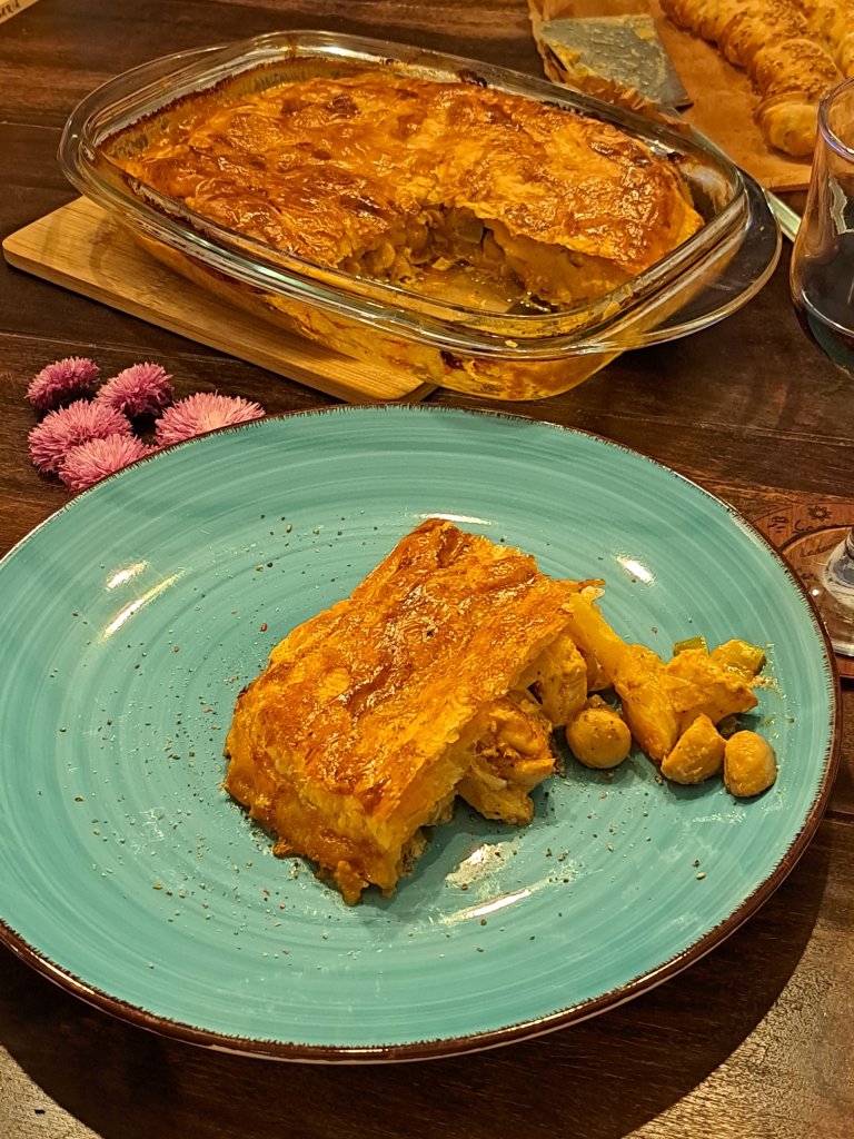 Пилешкия пай пека 25 минути в загрятата фурна до златист цвят и хрупкаво тесто.