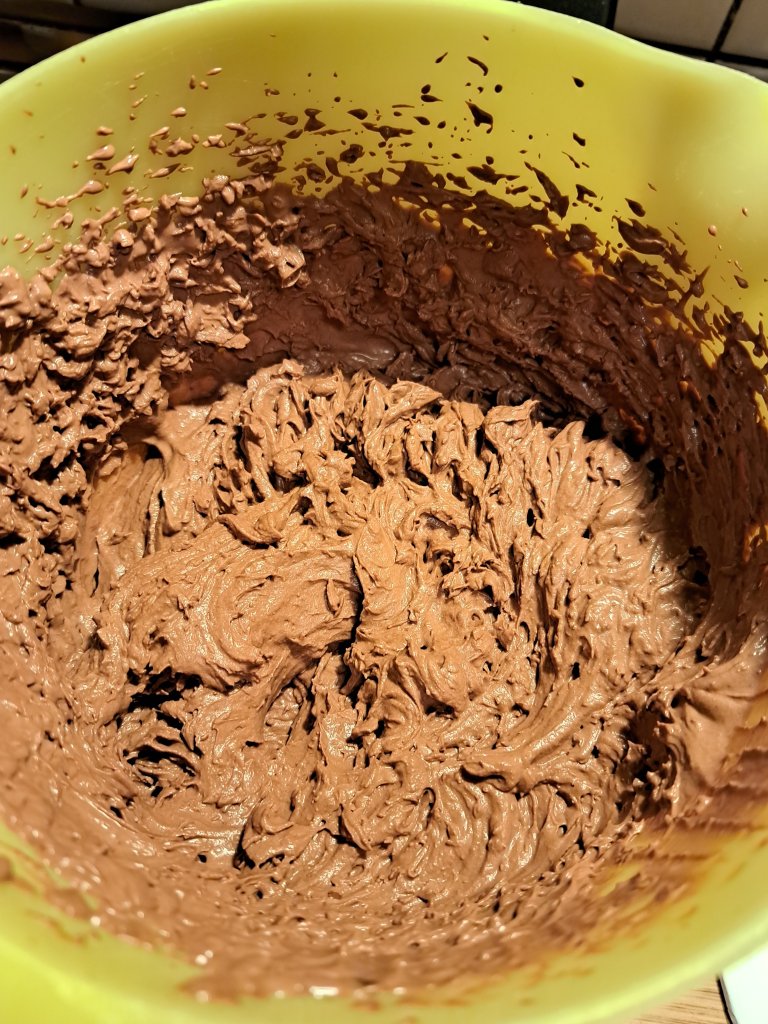 На другия ден добавям към шоколадовия крем ваниловата захар и разбивам с ръчен миксер до пухкав крем.
