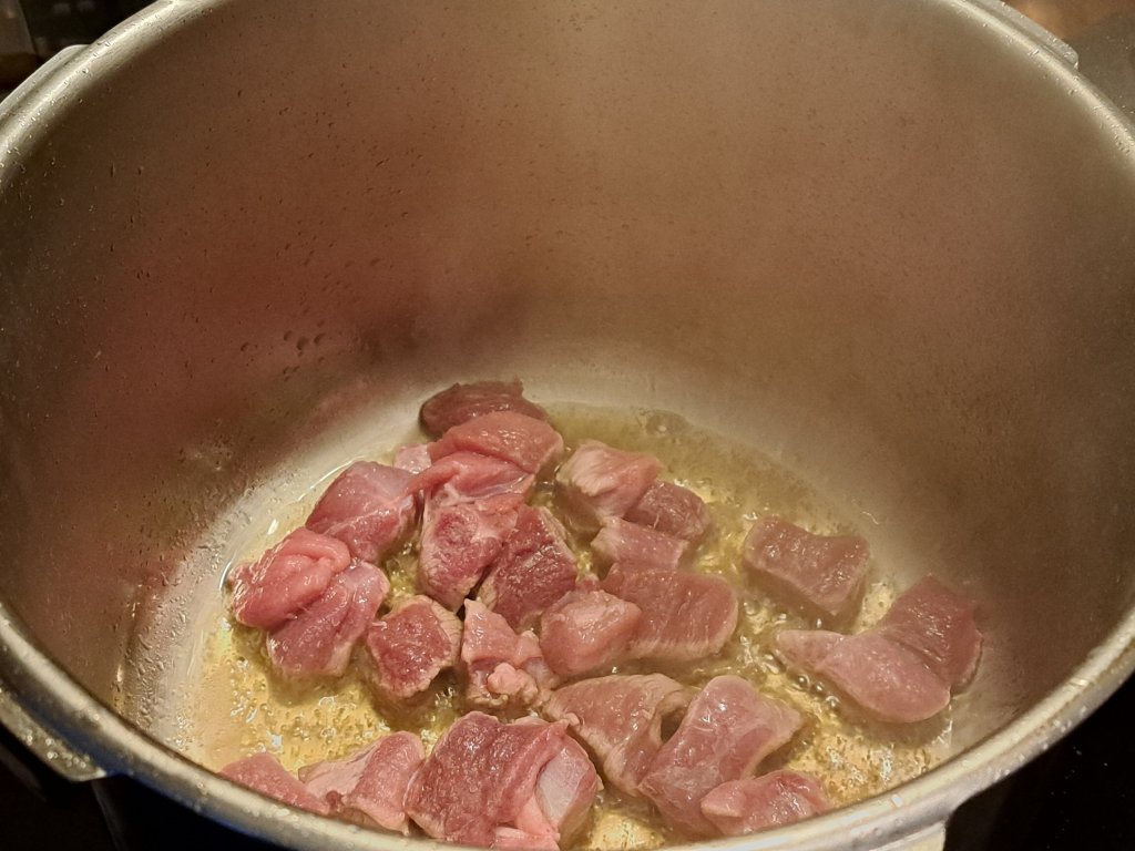 Загрявам мазнината и изпържвам месото на силен котлон до зачервяване.
