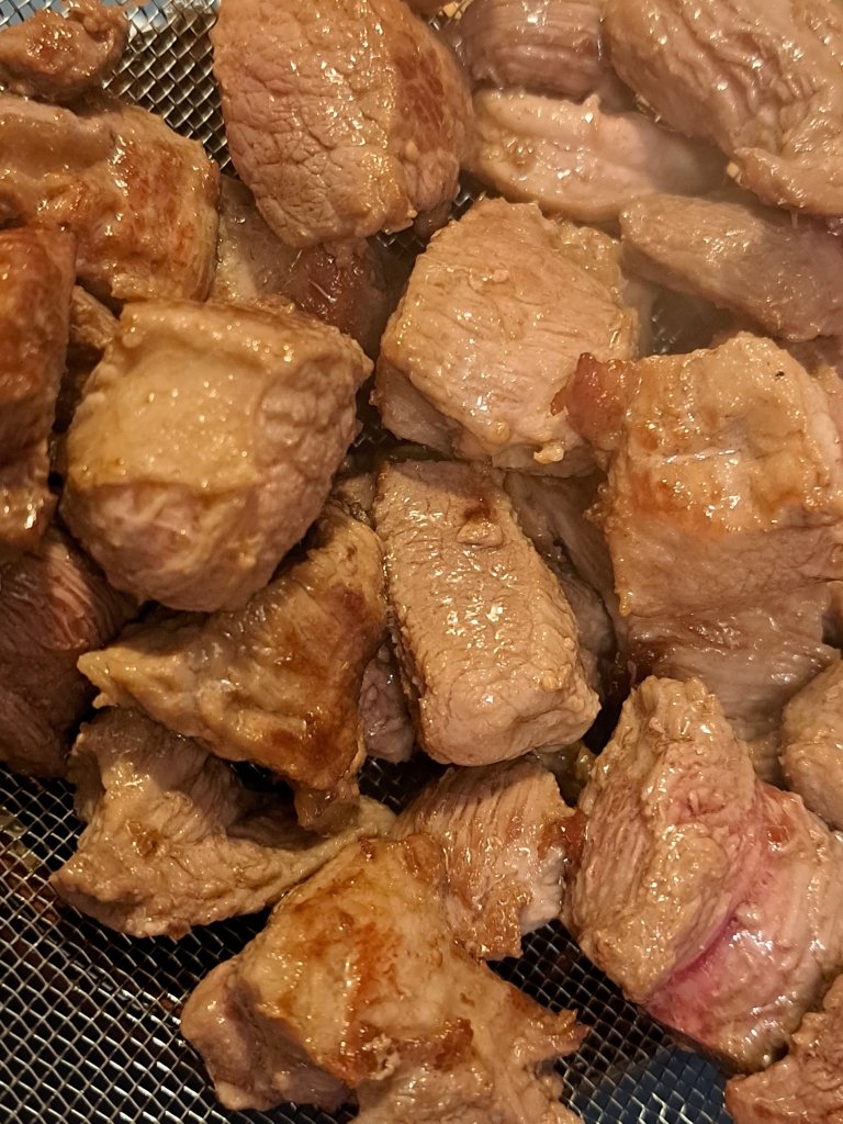 Почиствам месото от жилите, ако има и нарязвам на парчета, удобни за една хапка.