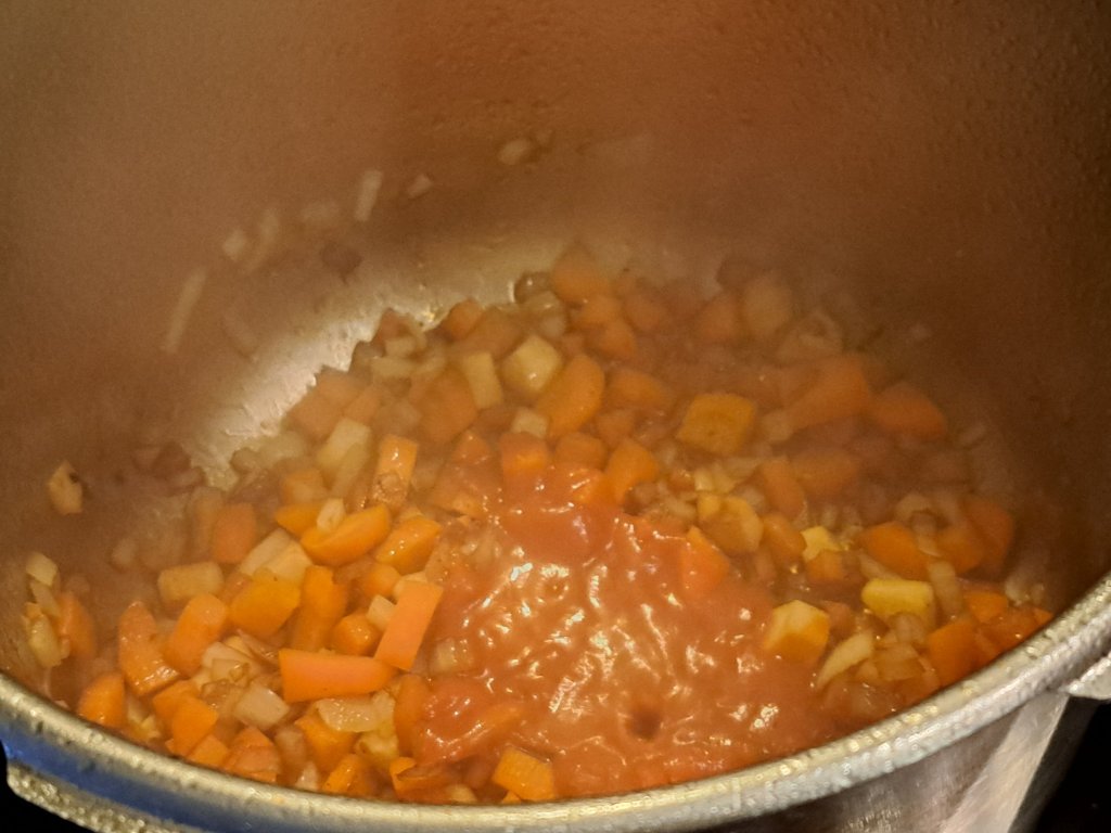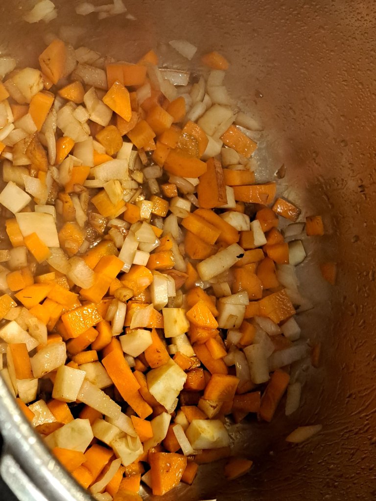 В тенджерата изпържвам за около 5 минути нарязаните на малки кубчета лук, целина, Марков.