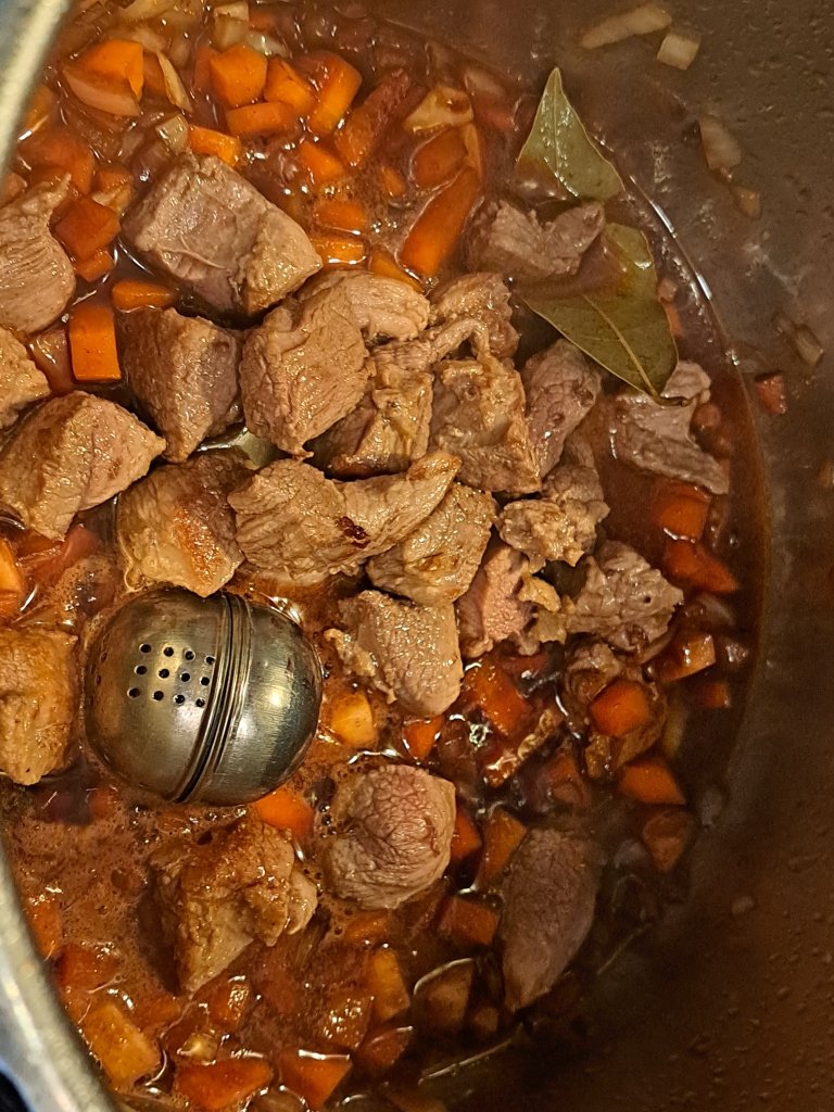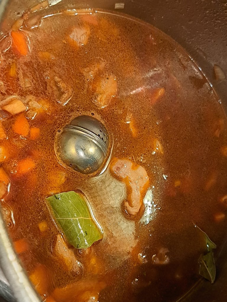 Заливам със 100 мл от виното и добавям подправките, но сложени в яйце за чай, за да ги извадя после лесно.