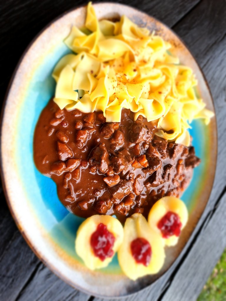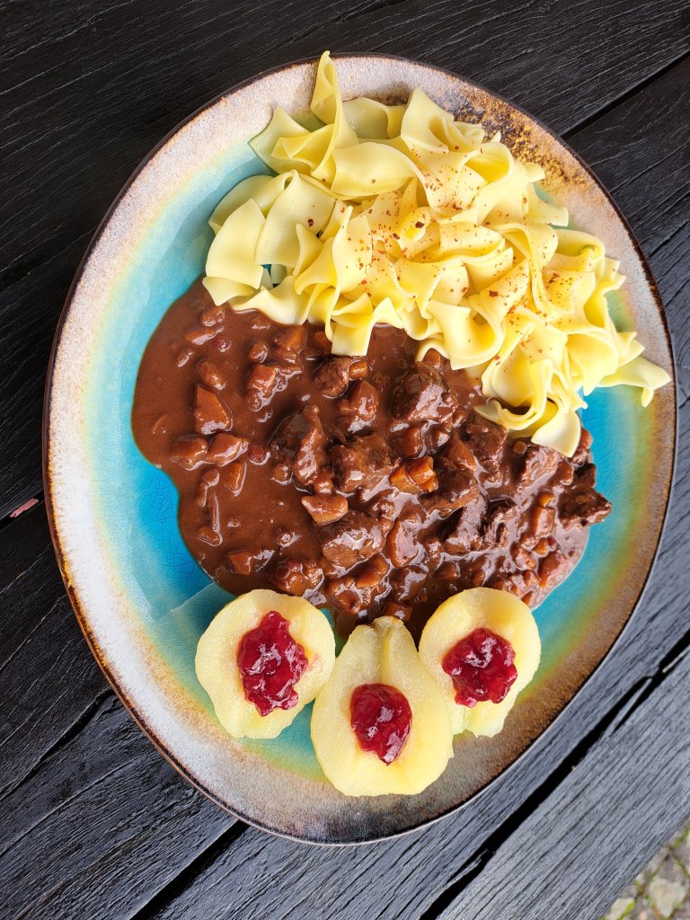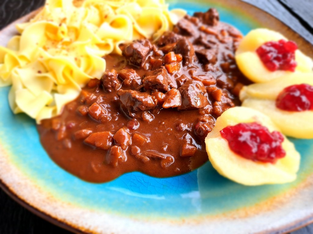 Сервирам дивечовия гулаш с паста и круши от компот с лъжичка боровинки в тях.