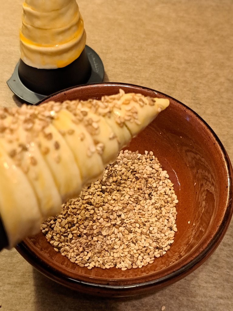 Ако искате по-малък размер фунийки да сервирате, навивате само една лента, но за по-голям размер наставяте с втора лента или просто режете тестото по дългата страна. Може леко с вода да намокрите края, за да залепне.