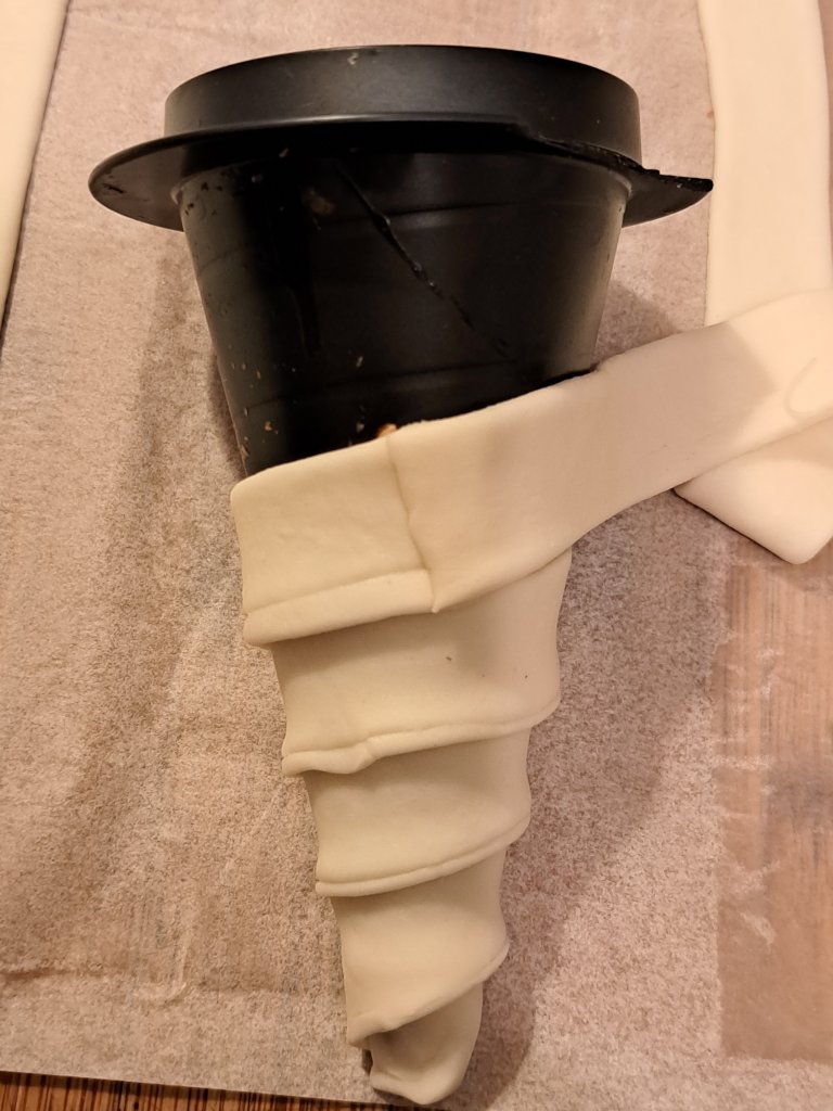 Има още един вариант на оформяне на тестото. Той е като изрязвам квадрати с размер височината на формите за фунийки. После всеки квадрат режа по диагонал така, че да получа два еднакви триъгълника, които увивам около формите.
