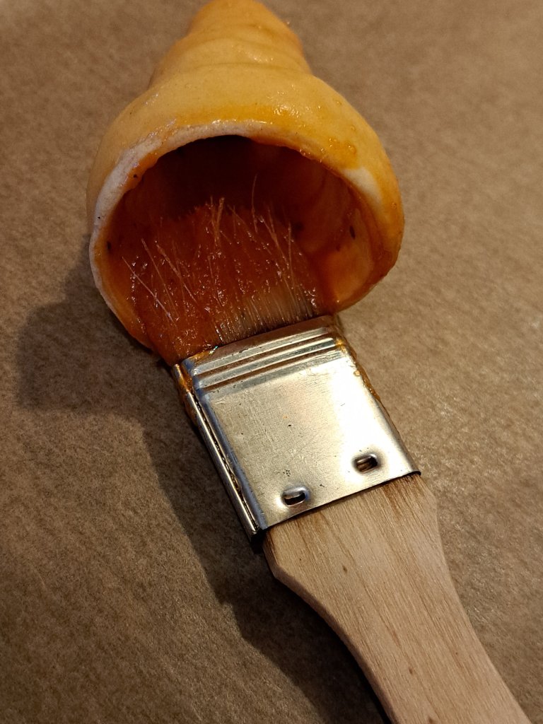 С помощта на четка нанасям обилно от доматения сос по вътрешните стени на фунийките. Не пестя соса
