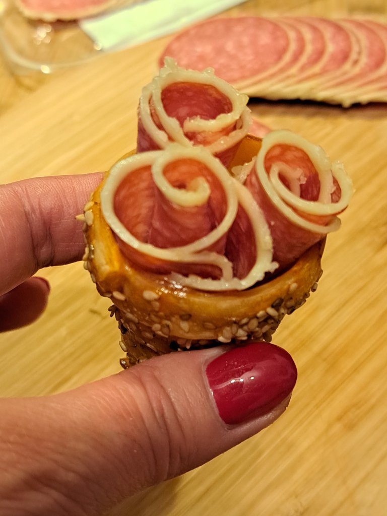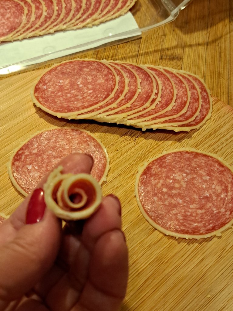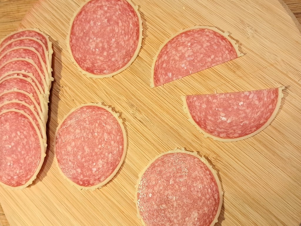 На другия ден настъргвам кашкавала, а саламчетата нарязвам на половина.