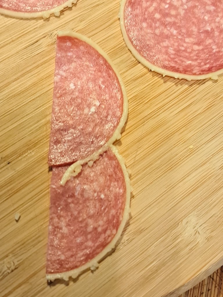 Подреждам половинките от салама две по две със застъпване и бялата част на салама да е отвън.