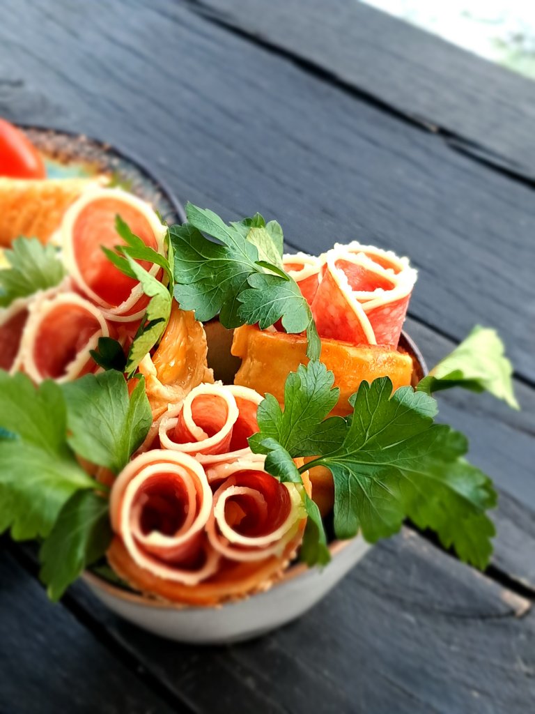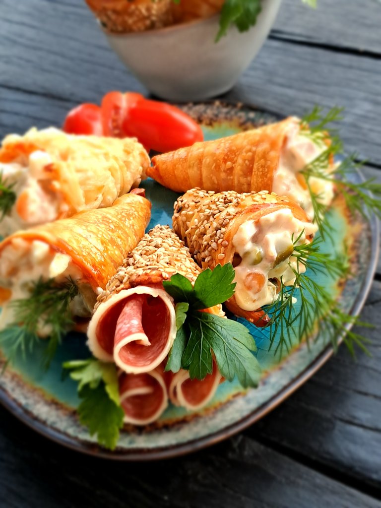 И тъй като се подготвям за парти, изпекох повече фунийки и една част напълних с домашна руска салата ЕТО ТУК. Друга част с немската Fleischsalat РЕЦЕПТА ЕТО ТУК. Възможно е да се правят най-различни комбинации.