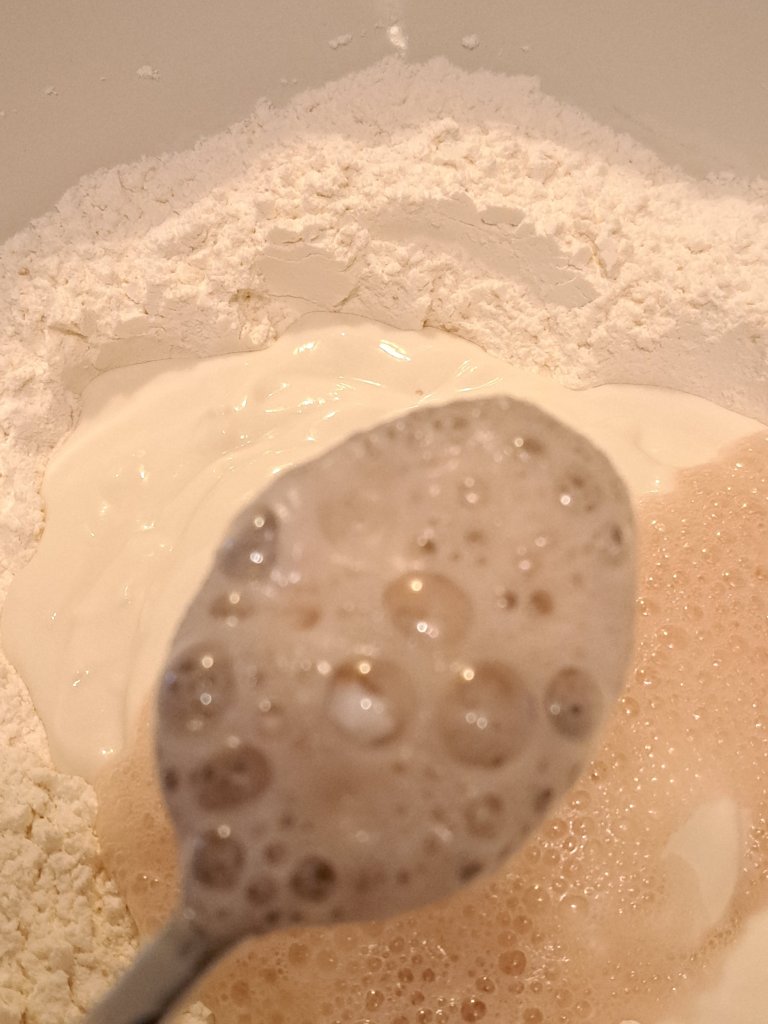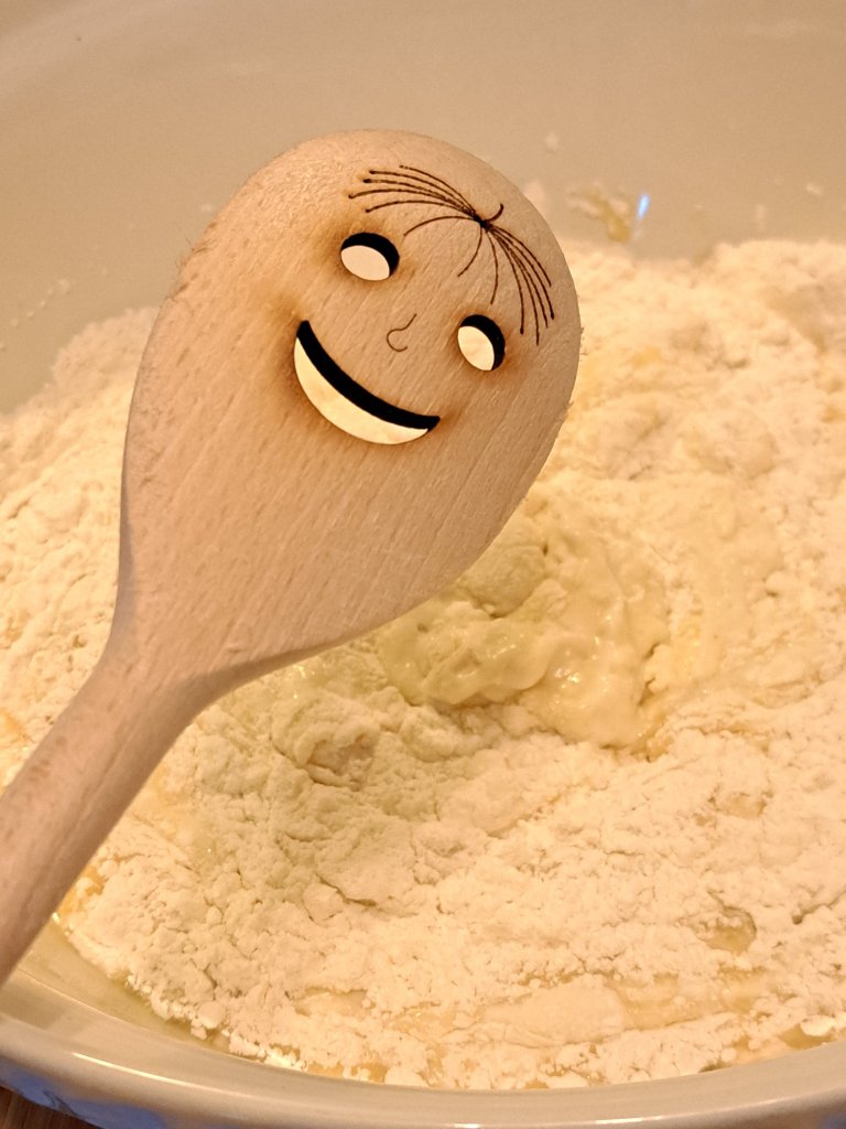 Месенето е с дървена лъжица като взимам малко по малко от брашното.
