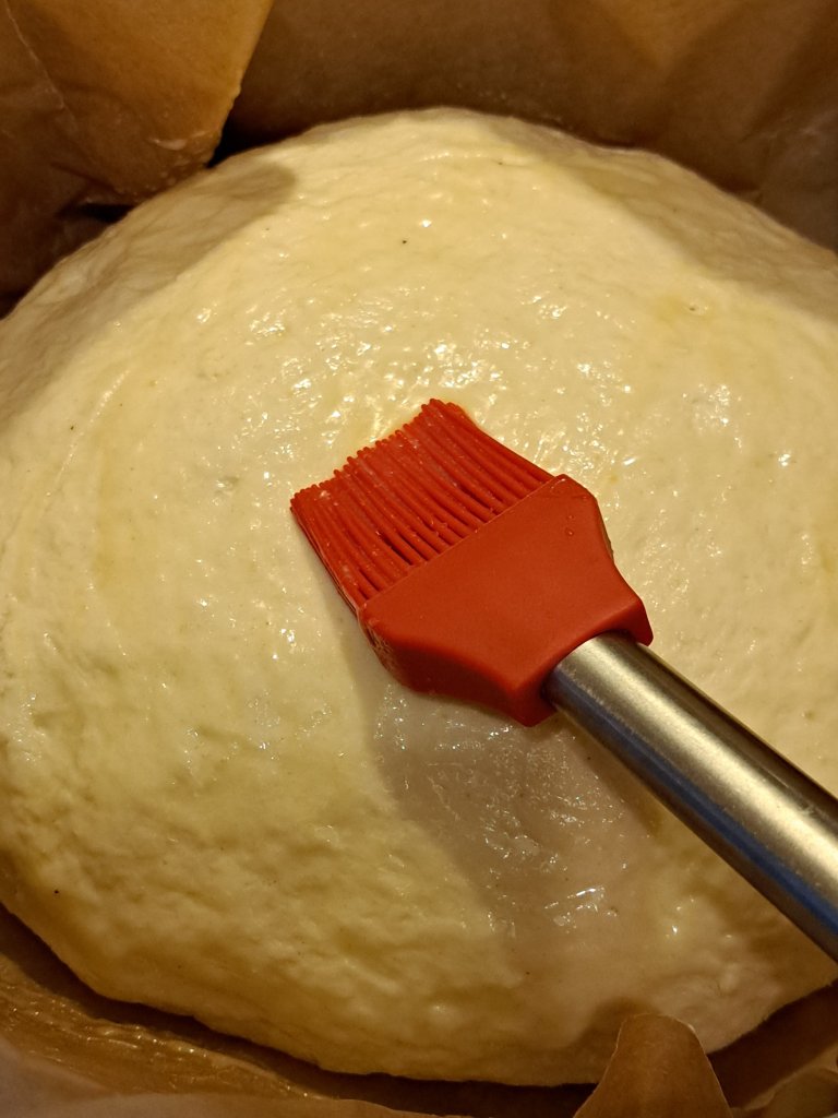 Слагам питката в тава с хартия за печене, леко натискам, за да заеме формата на тавата и намазвам с останалото от „яйцата“.