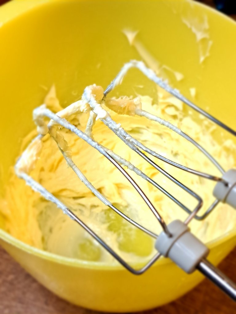 Маслото разбивам с миксера до пухкаво и почти бяло, след това добавям крема сиренето като вече не разбивам, защото много лесно може да се пресече маслото от студеното крема сирене.