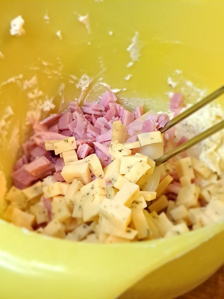 Заедно с шунката и кашкавала го добавям към крема.