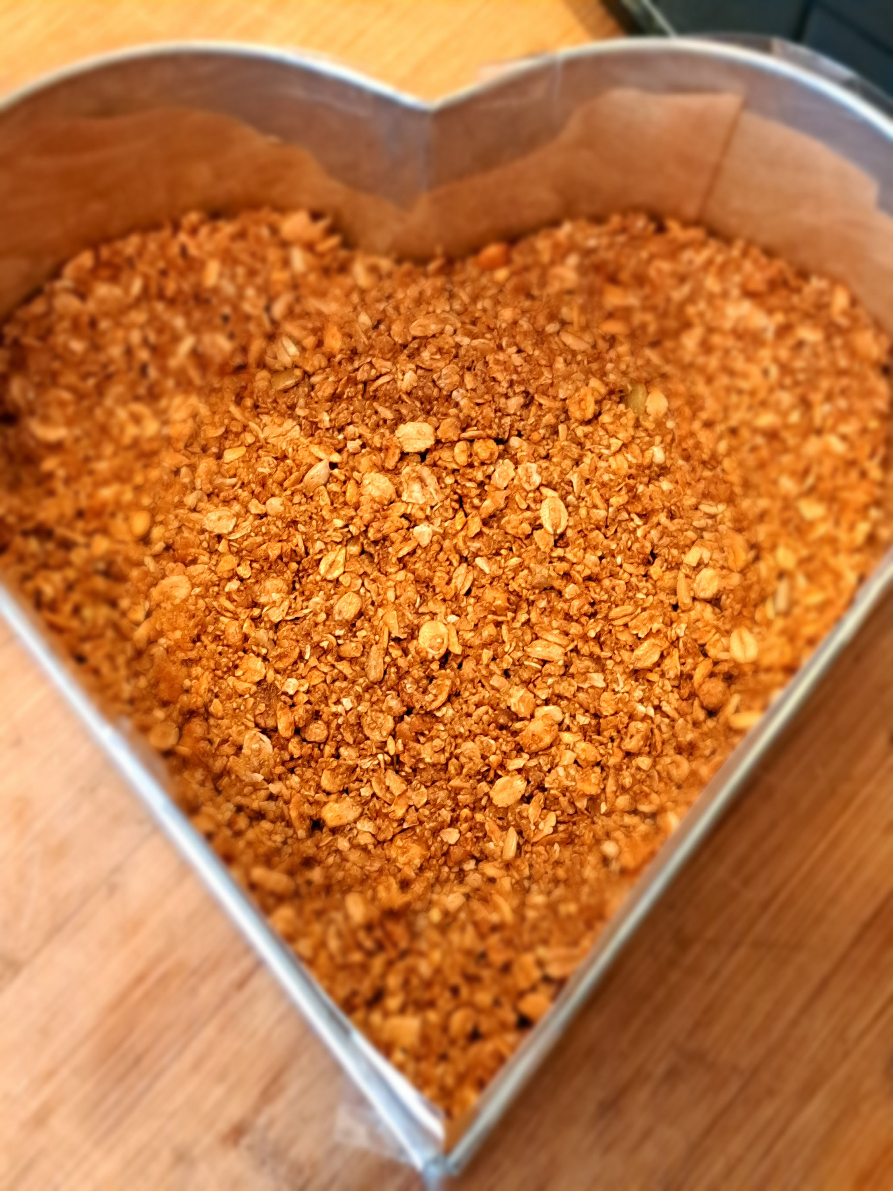 Блатът е с гранола и пълнозърнести бисквити. Какво е гранола? Е, това е здравословна закуска. Приготвя се от различни видове ядки, овесени ядки, сушени плодове и кленов сироп. Ще напиша рецепта, при повече свободно време. Намира се и в някои магазини. В нашето село в Германия няма и затова си приготвям сама гранола или купувам от Нидерландия.