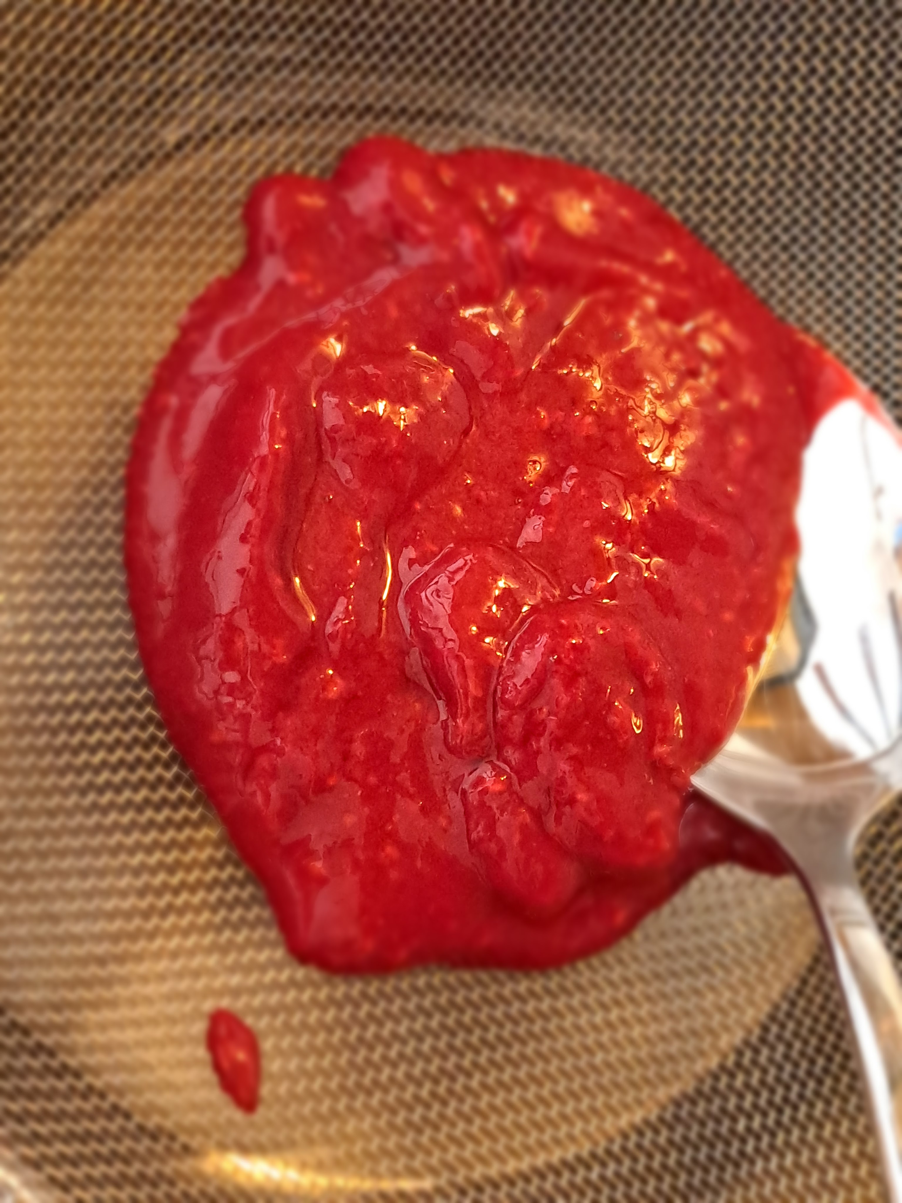 През това време вече съм размразила малините и ги минавам първо на блендер, за да ги смеля или с пасатор. Кой както му е удобно. След това изсипвам в гевгир (цедка), за да им се отделят семките. Получава се пюре, което аз допълних с този готов немски крем. Тук той се продава на рафтовете с конфитюри и е нещо като рядко кули. Или сварени малини, леко подсладени, пюрирани и с желатин леко втвърдени. Използва се за намазване на филия хляб или подслаждане на сладкиши.