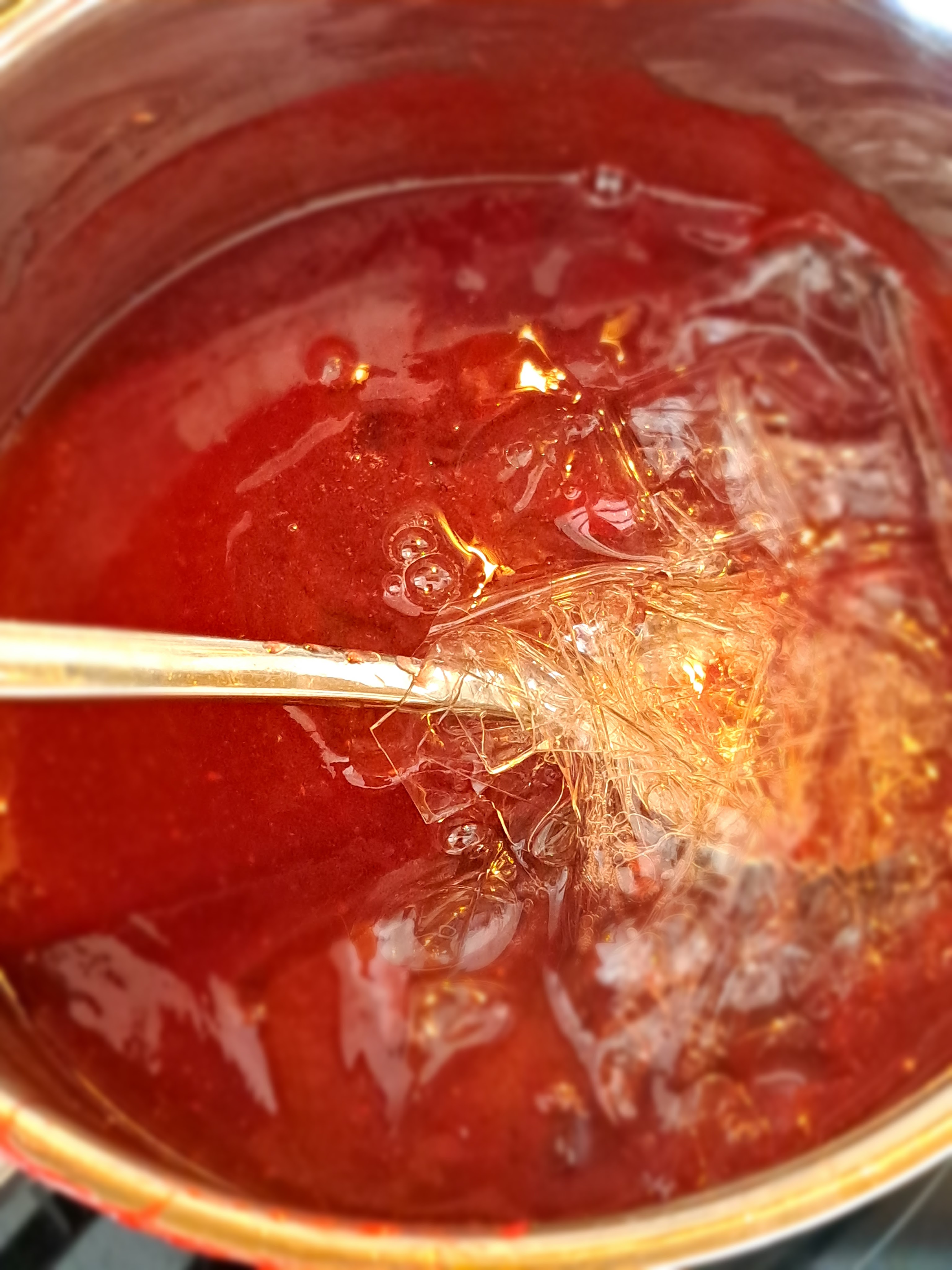 Не позволявам пюрето да завира. Изключвам котлона, изтисквам желатина от водата и го добавям към горещото пюре. Бъркам до пълното му разтопяване. После отделям от печката на хладно място, докато се охлади и леко започне да стяга по стените на съда. Един съвет: ако не Ви се чака, просто го прехвърлете в друг студен съд, за да спестите от времето за охлаждане.