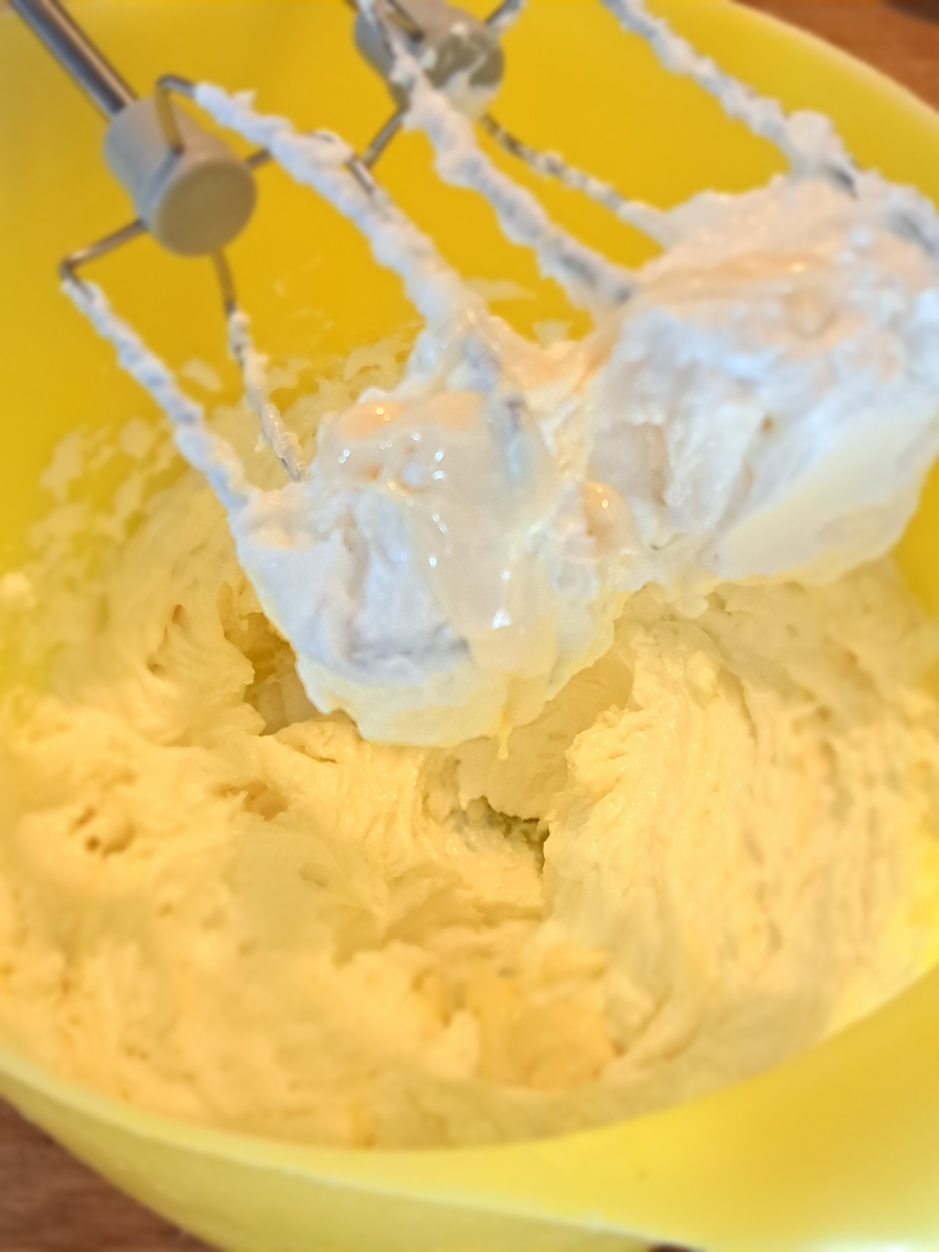 Разбивам сметаната с ръчен миксер до меки връхчета.