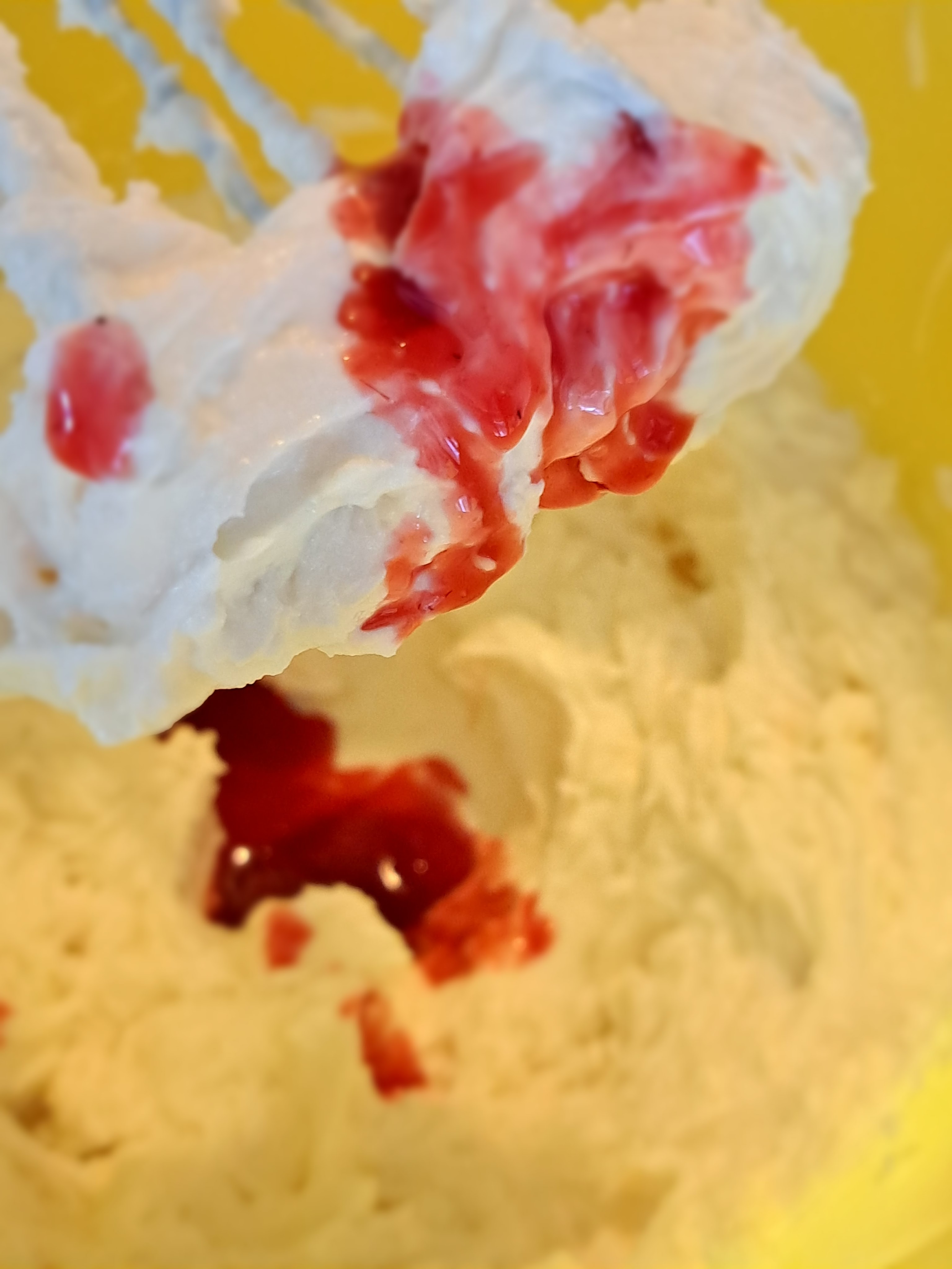 След това добавям отново на тънка струйка охладеното малиново пюре и не спирам да разбивам.