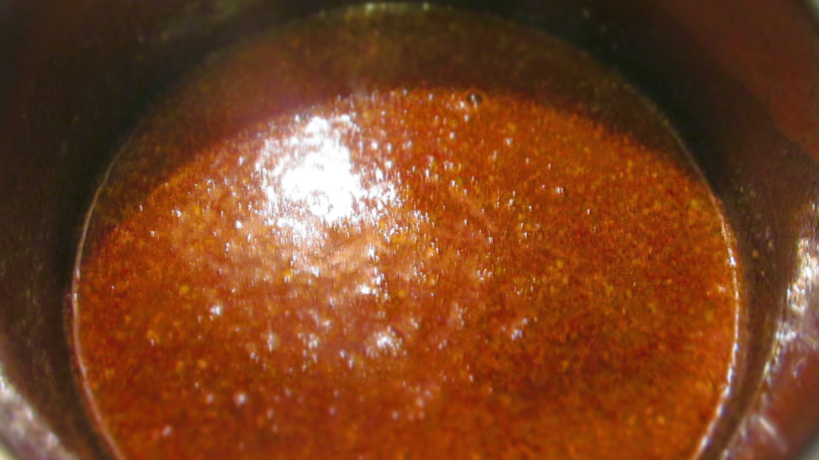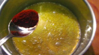 - Ние не обичаме червеният пипер да е загорял /това става много бързо, ако тенджерката е на горещия котлон/, защото започва да нагарча и поради тази причина, отделям разтопеното масло от горещия котлон.