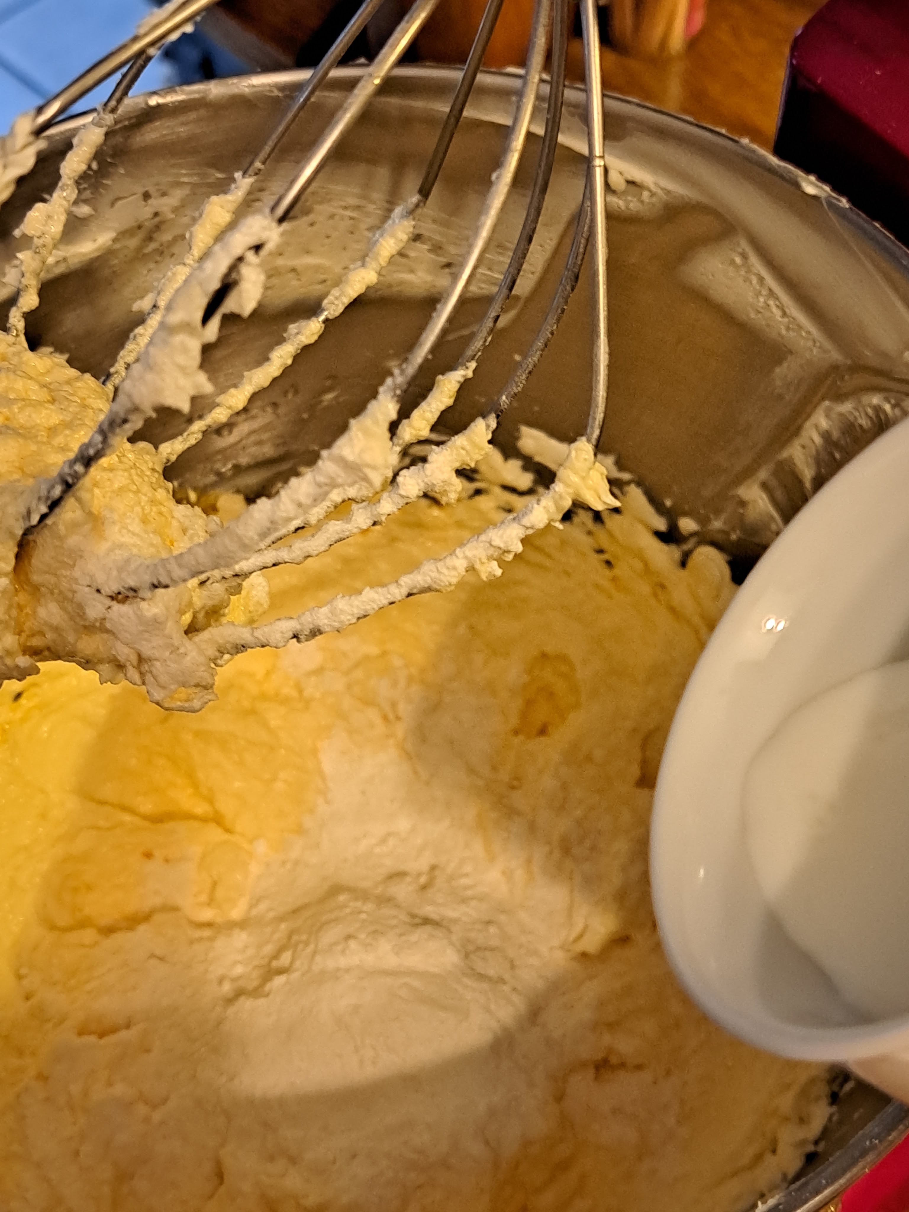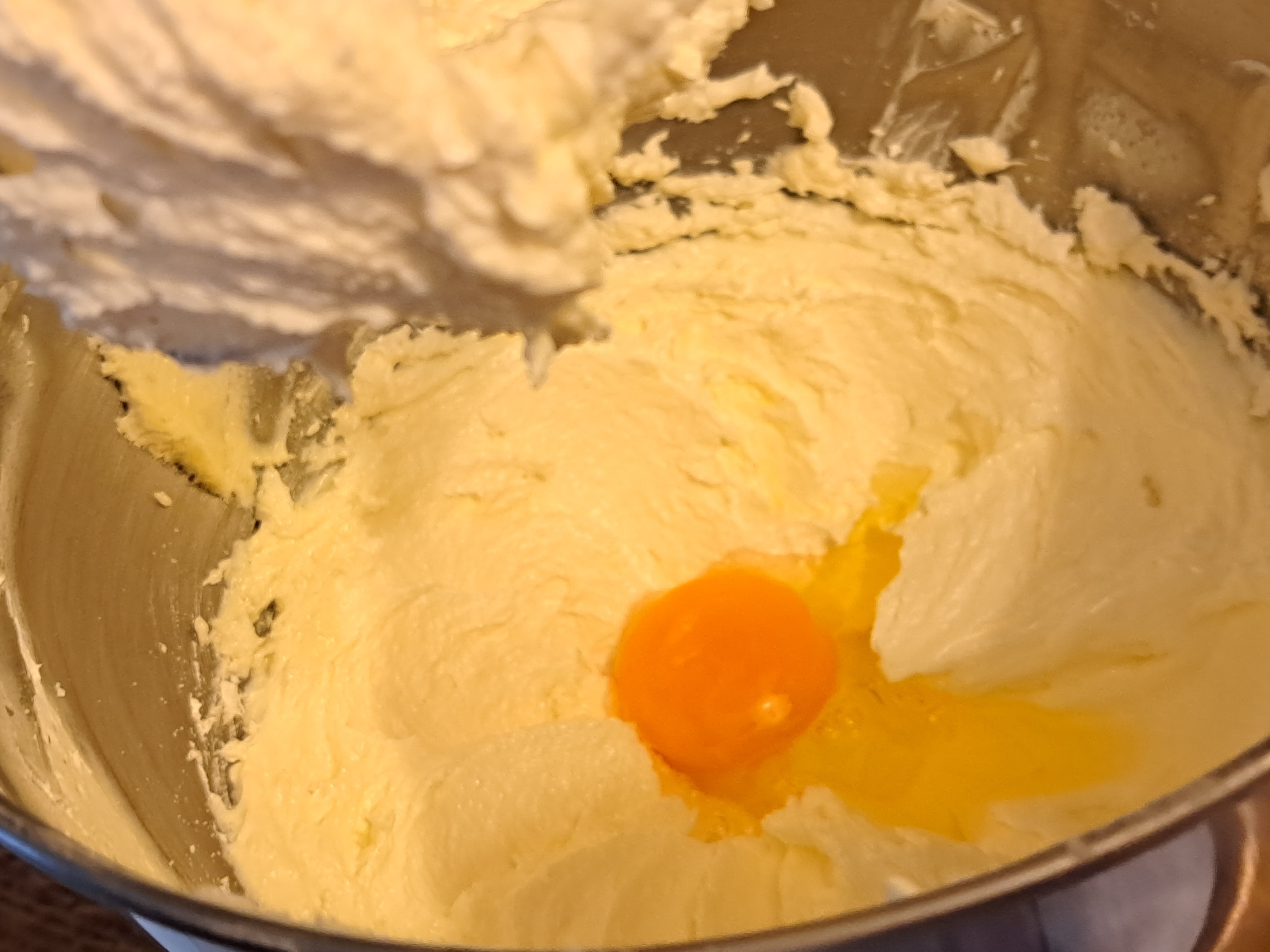 Тези, които ме следват познават този принцип – добавям едно яйце, разбивам до смесването му с крема, добавям второто яйце, разбивам и т. н. Това се прави с цел да не се пресече маслото.