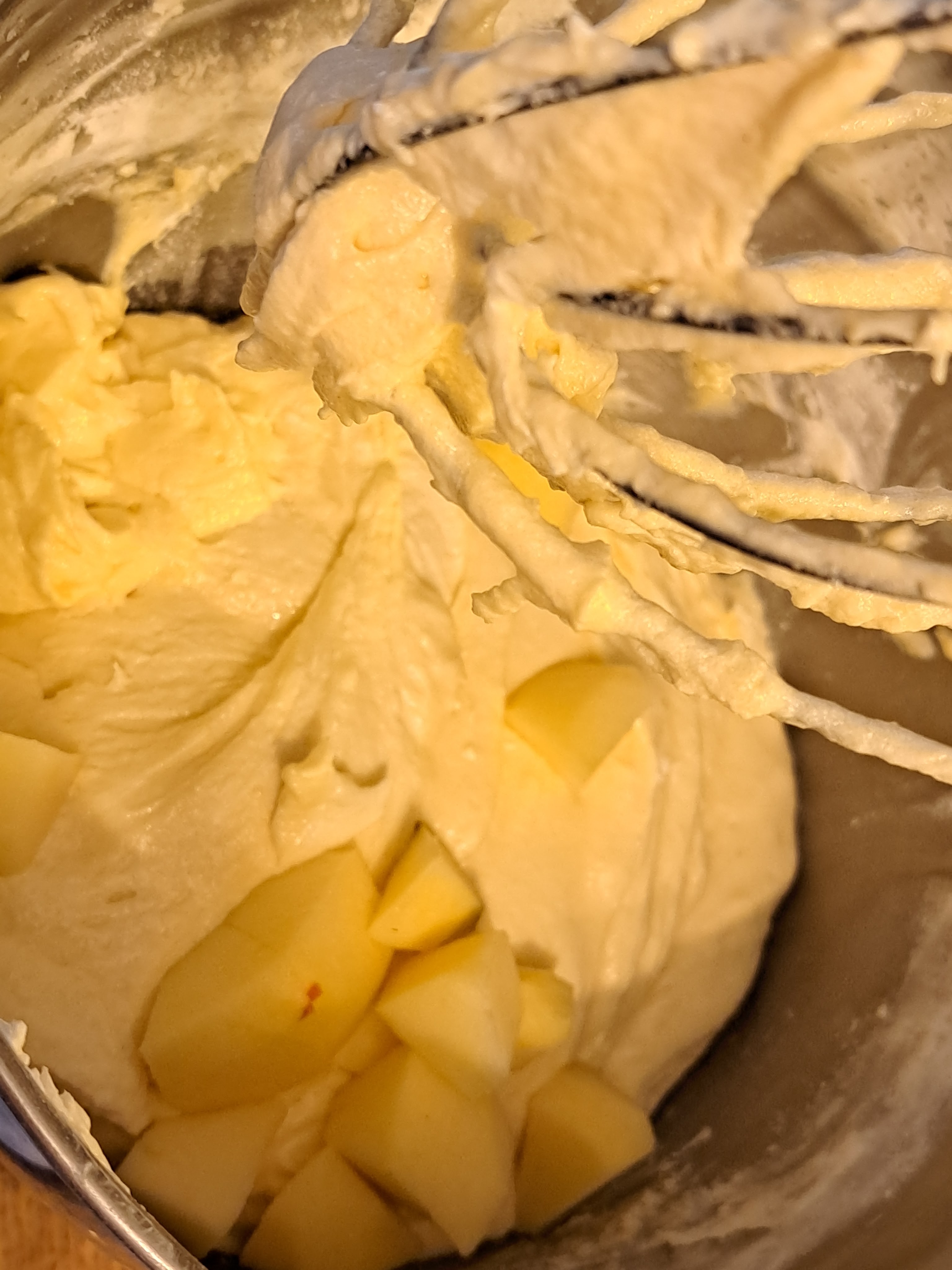 Добавям ябълките към тестото и леко разбърквам, но не с миксер.