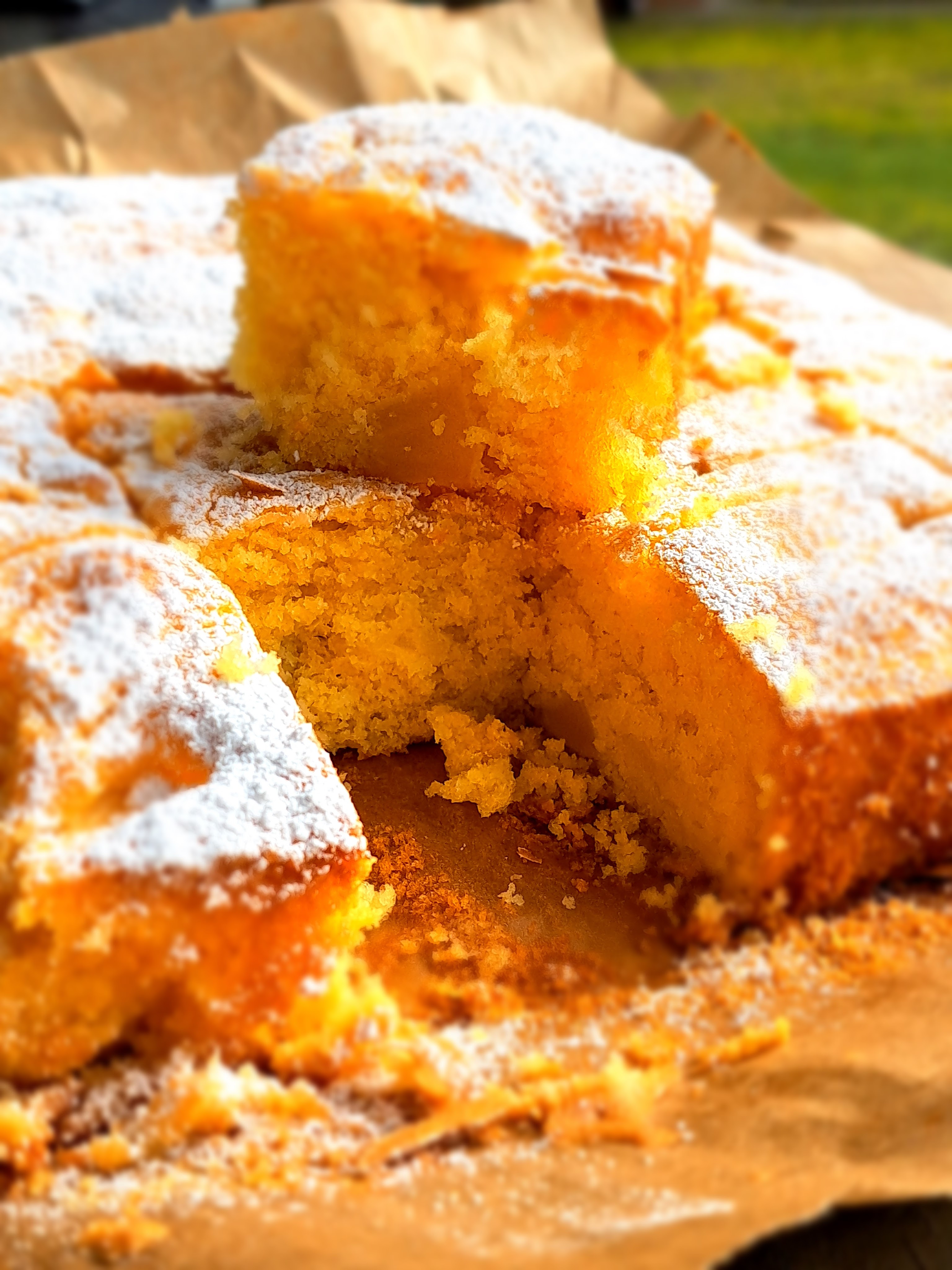 Сервирам сладкиша охладен и поръсен с пудра захар.