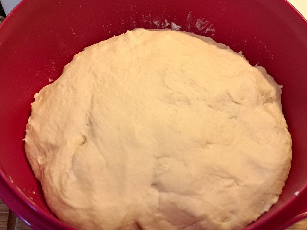Изсипвам в купата за втасване и покривам с капак или стреч фолио. Времето за втасване е до 1 час на стайна температура. При някои ще е по-бързо, при други по-бавно. Тестото удвоява обема си.