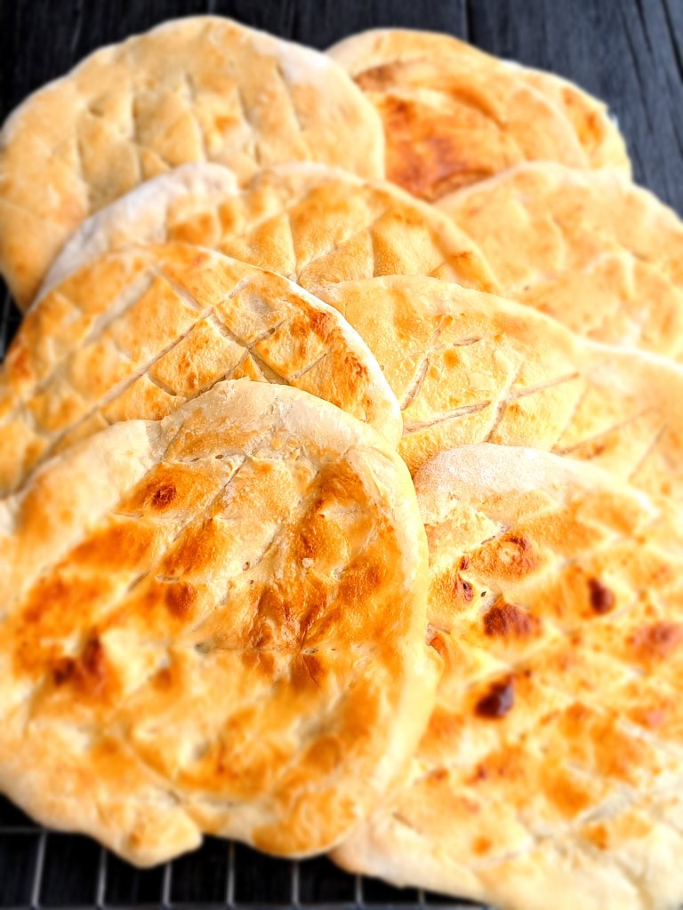 Всяка топка разточвам върху плота, поръсен с много брашно до около 20 см в диаметър. Не повече, защото иначе стават твърди и хрупкави, след изпичането.
