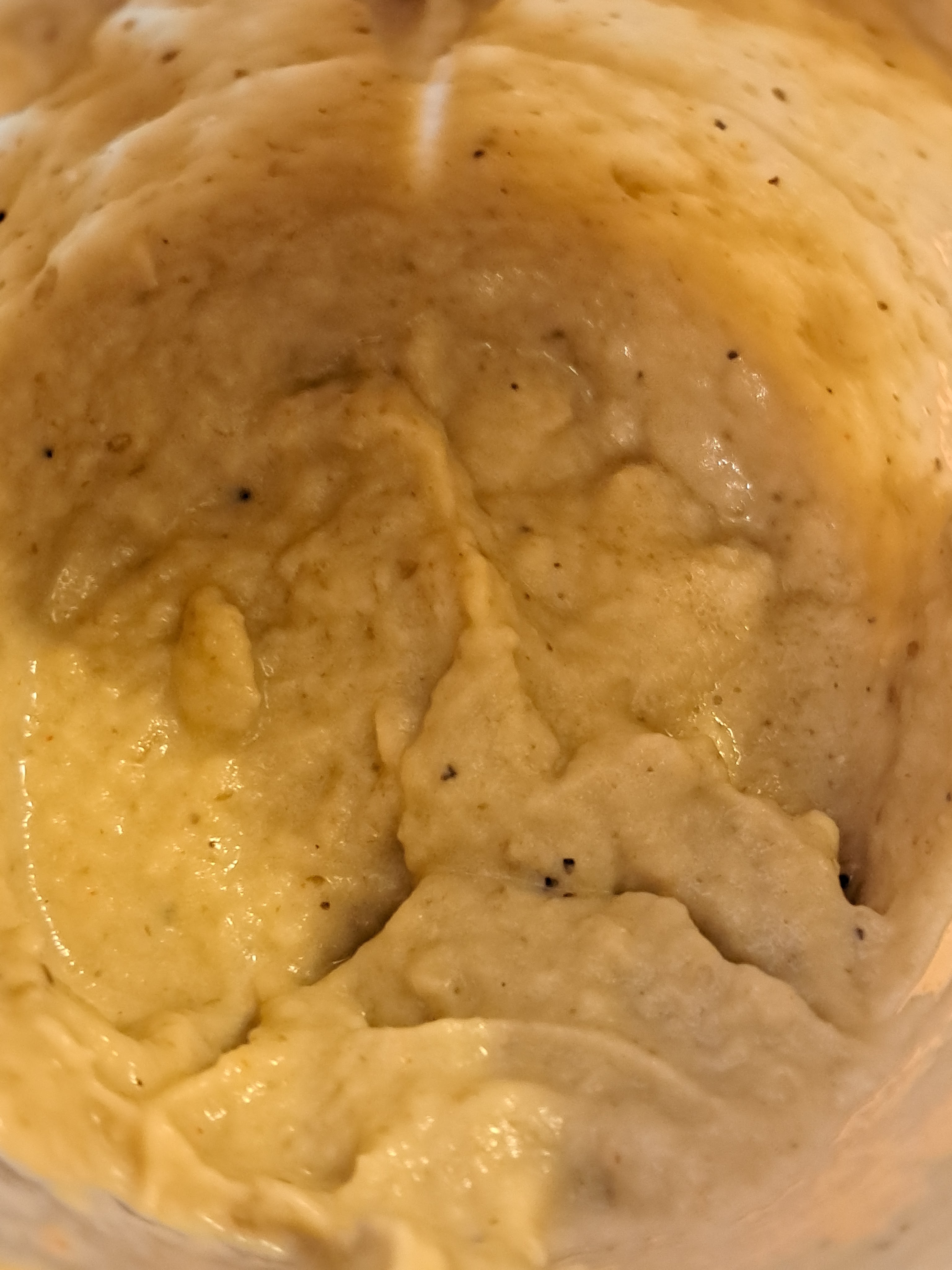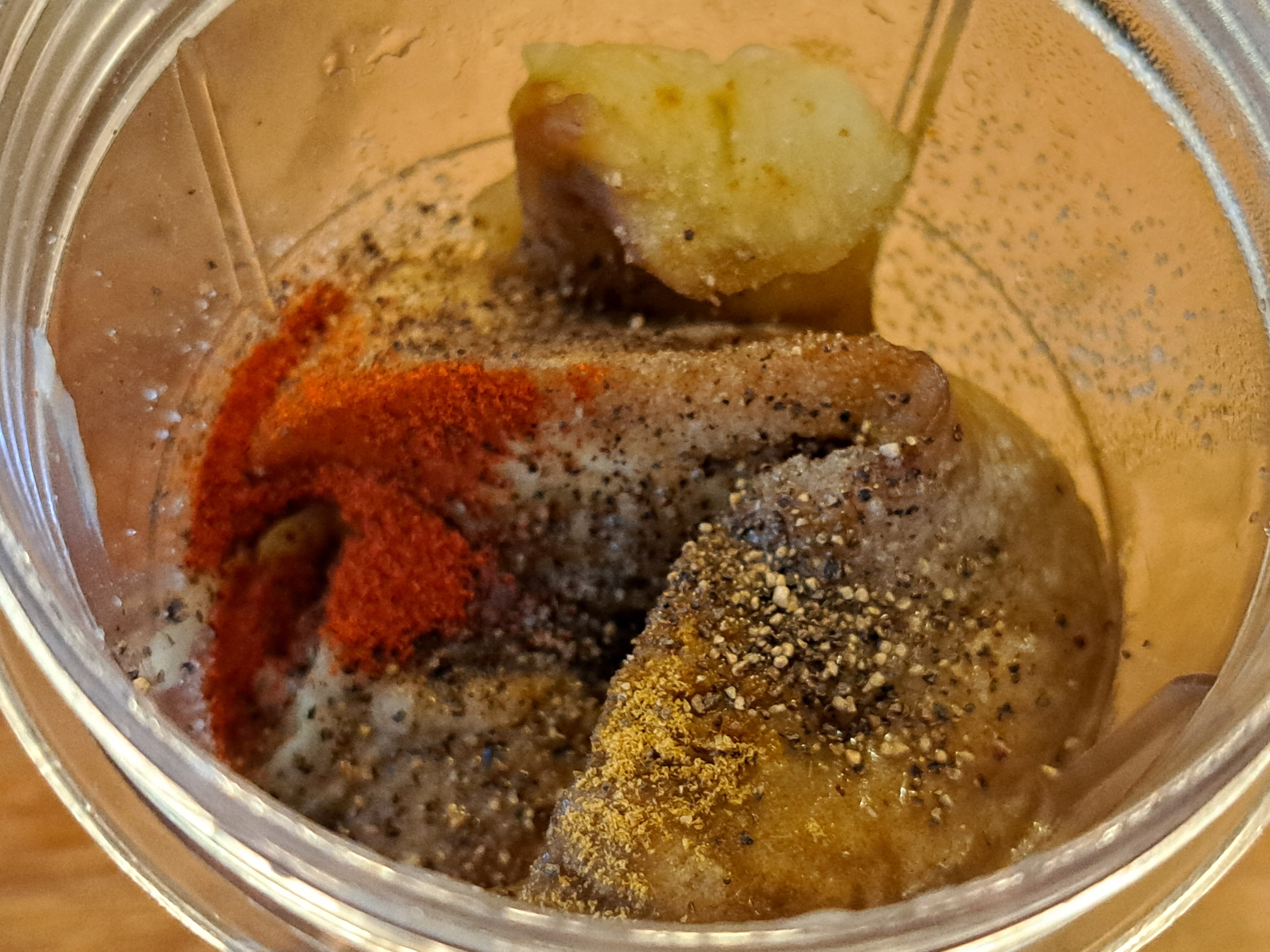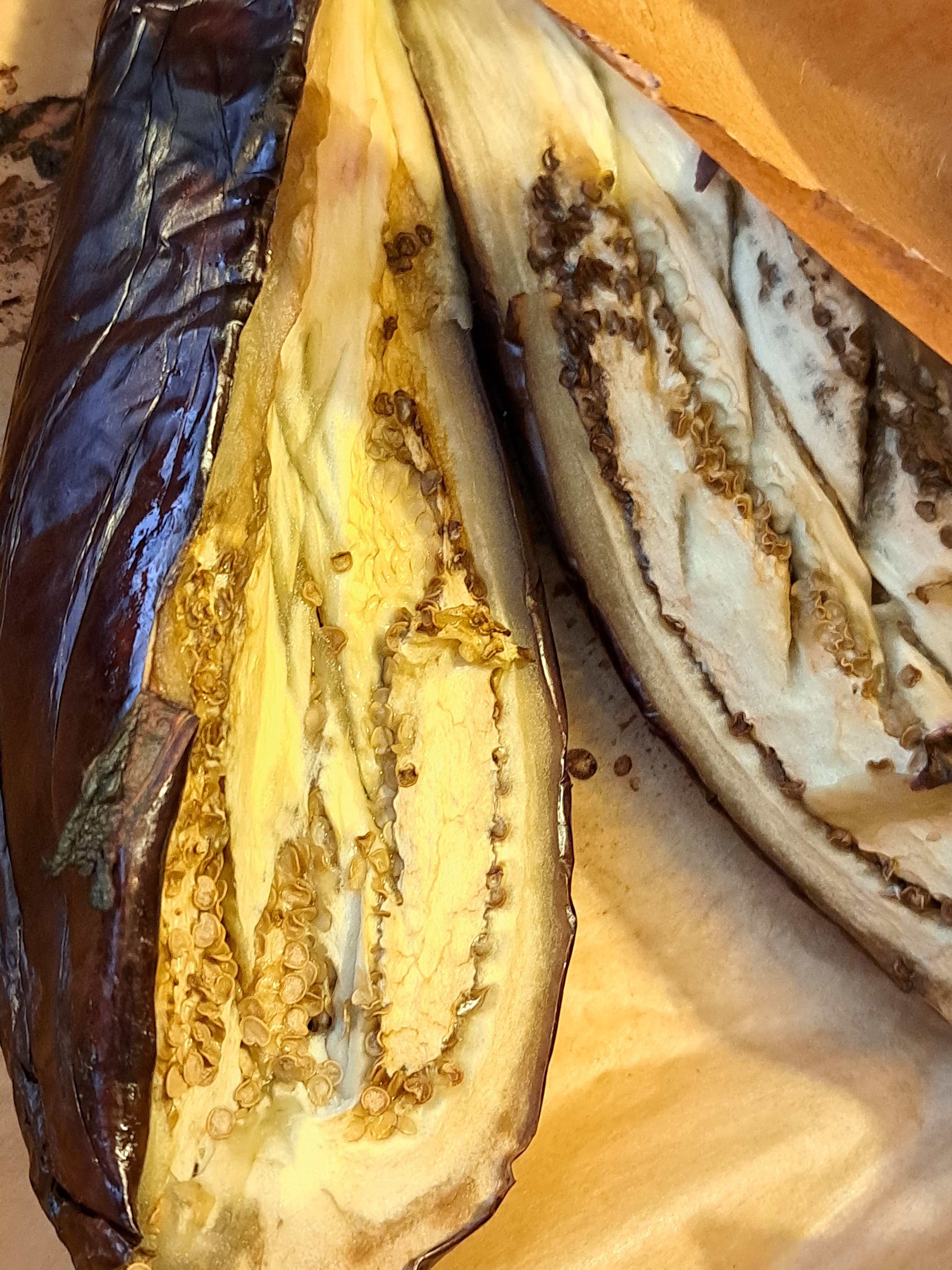 В миксер или блендер слагам чесъна (обелен), сусамовата паста, сокът от лимон, може и настърганата кора от лимон, месото на патладжана (обелвам задължително) сол, черен пипер, кимион, част от червения пипер, още малко зехтин.