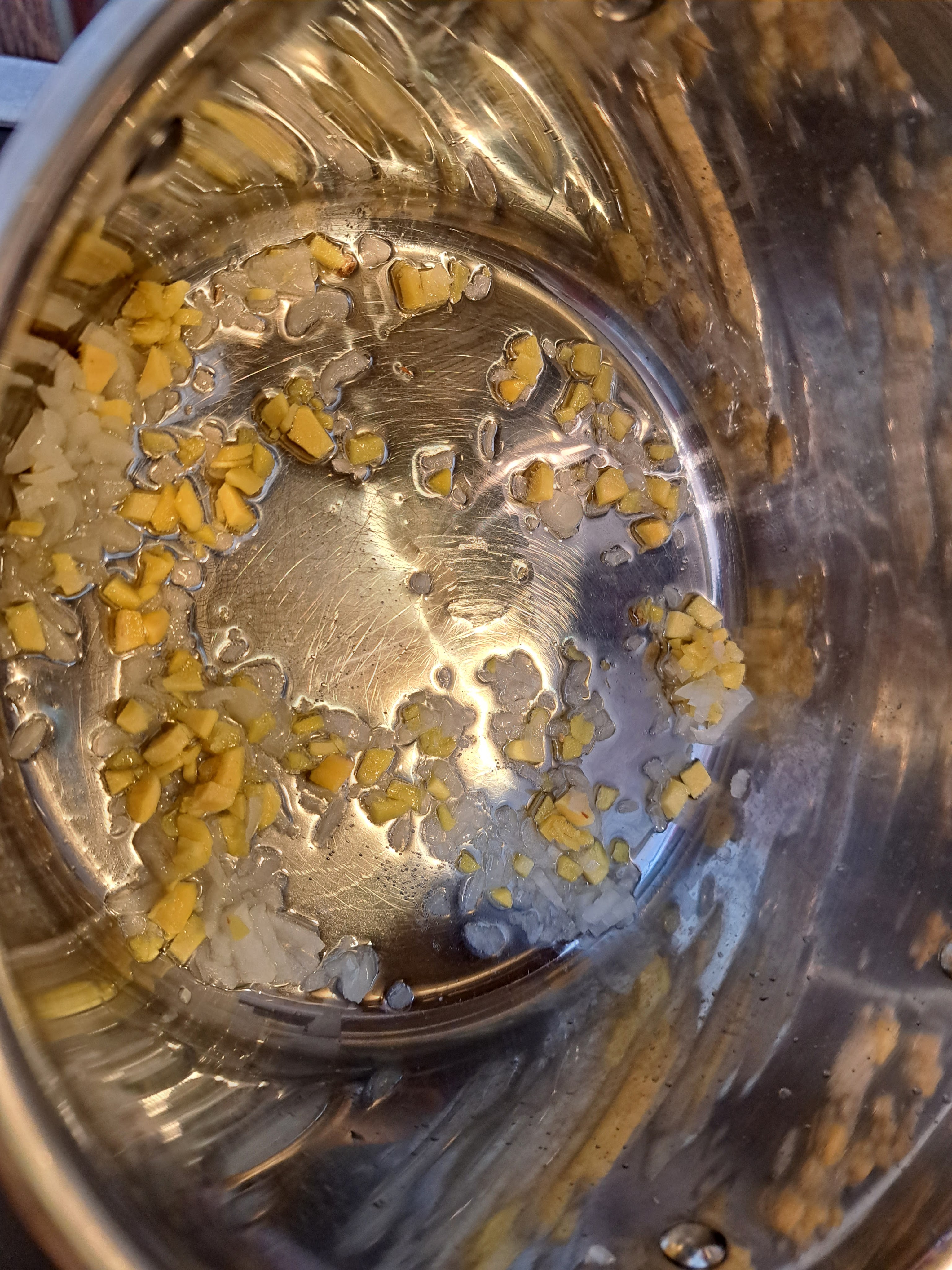 Загрявам кокосовото олио в тенджера и задушавам под капак и на средна мощност на котлона, нарязаните на малки кубчета кромид лук и джинджифил.