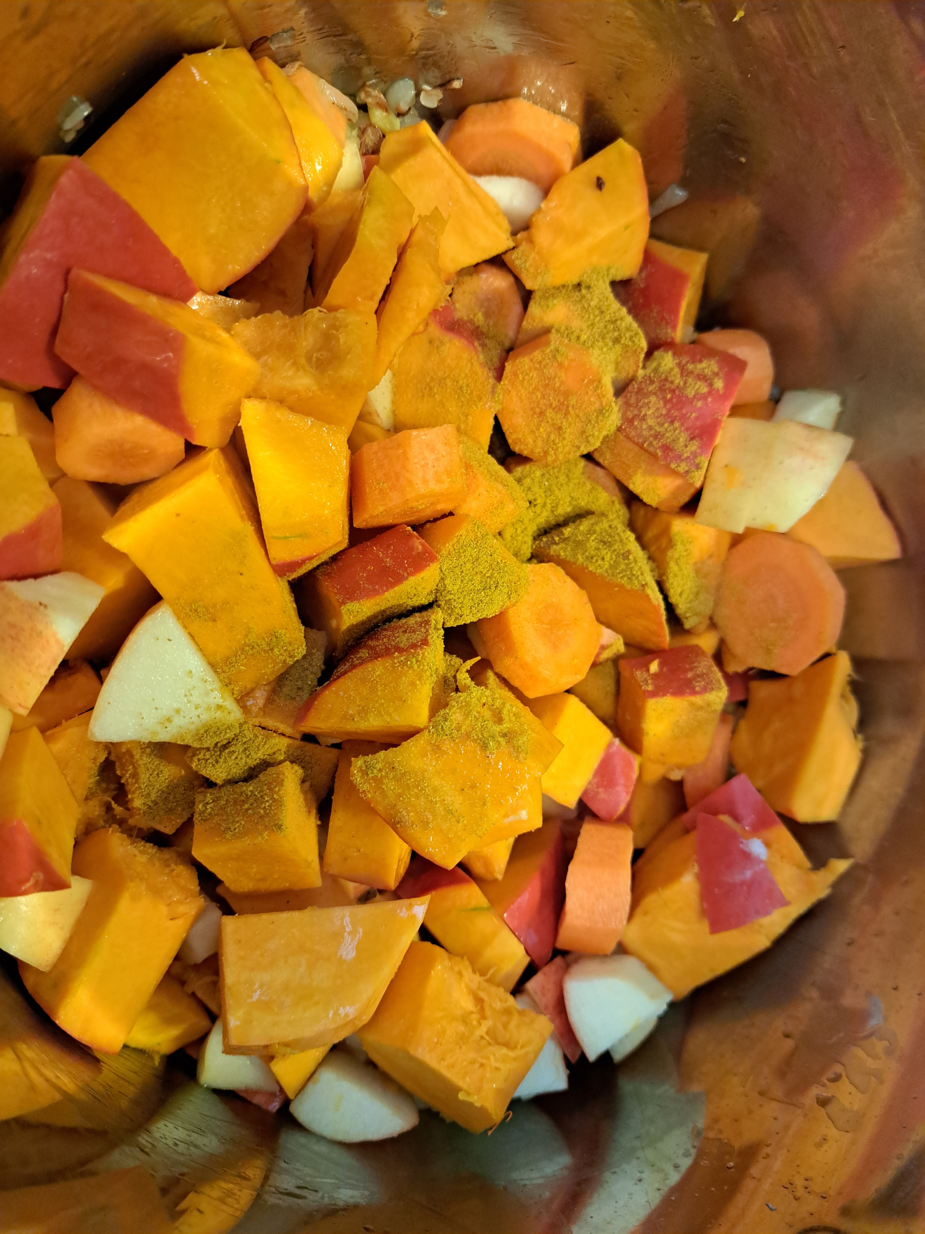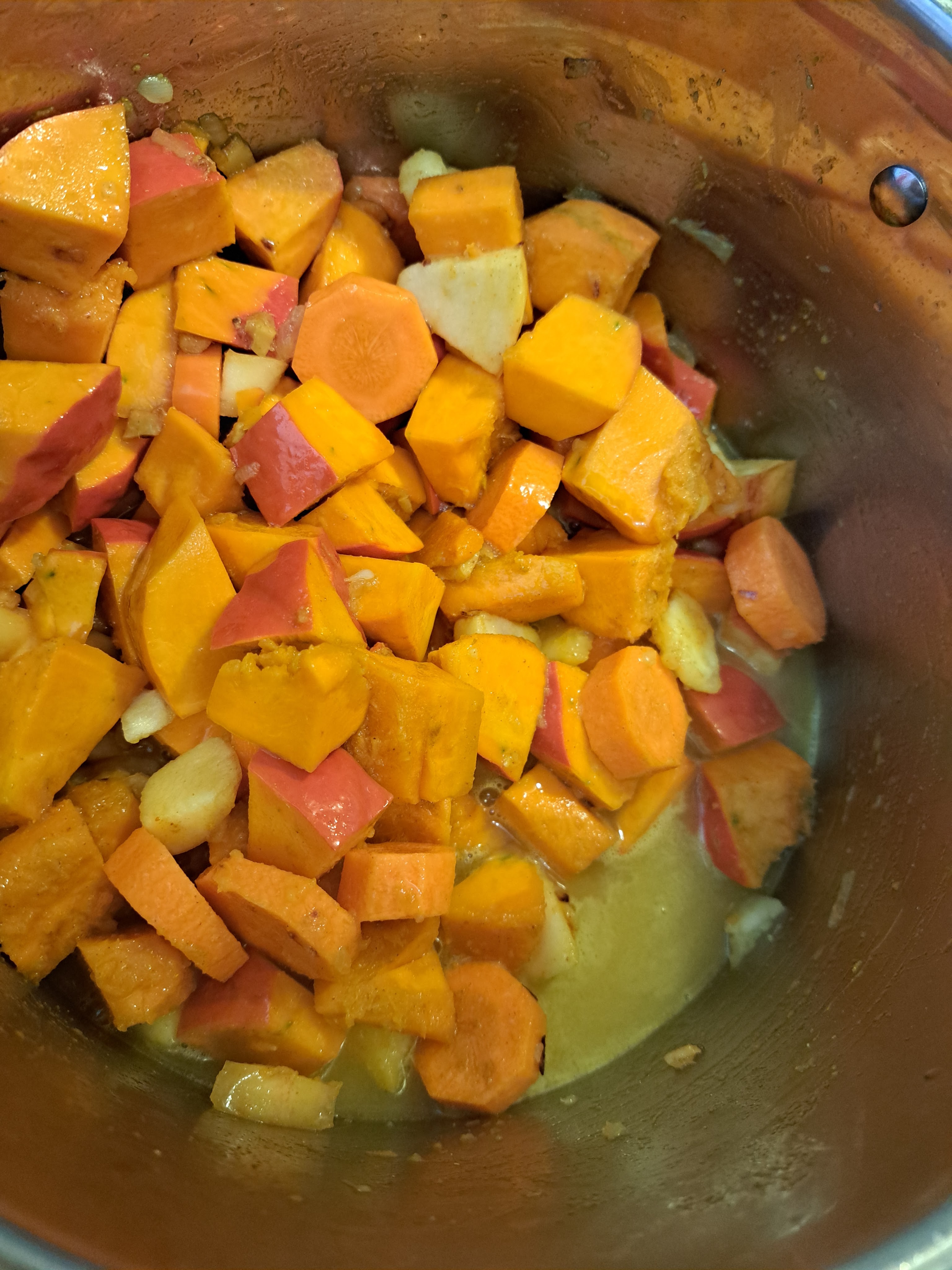 Добавям измитата и нарязана на едри кубчета тиква, обелените и нарязани на дебели колелца моркови, почистената и нарязана на кубчета ябълка, кърито.