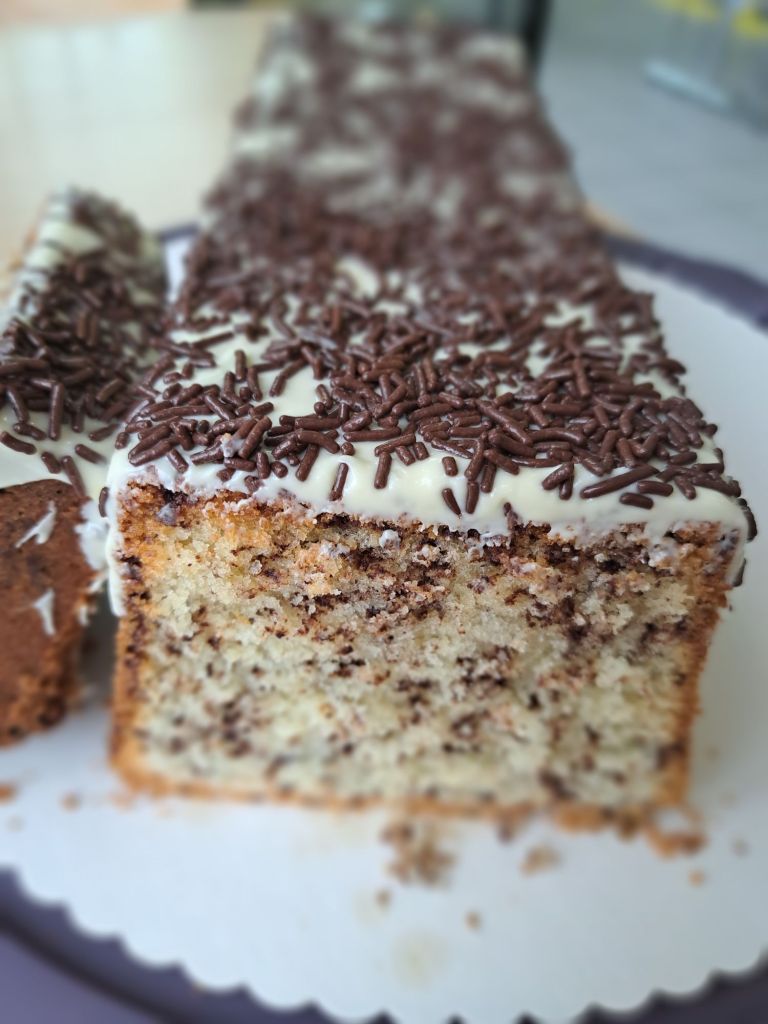 През това време разтопявам на водна баня кувертюра, заливам кекса и поръсвам с шоколадови пръчици.