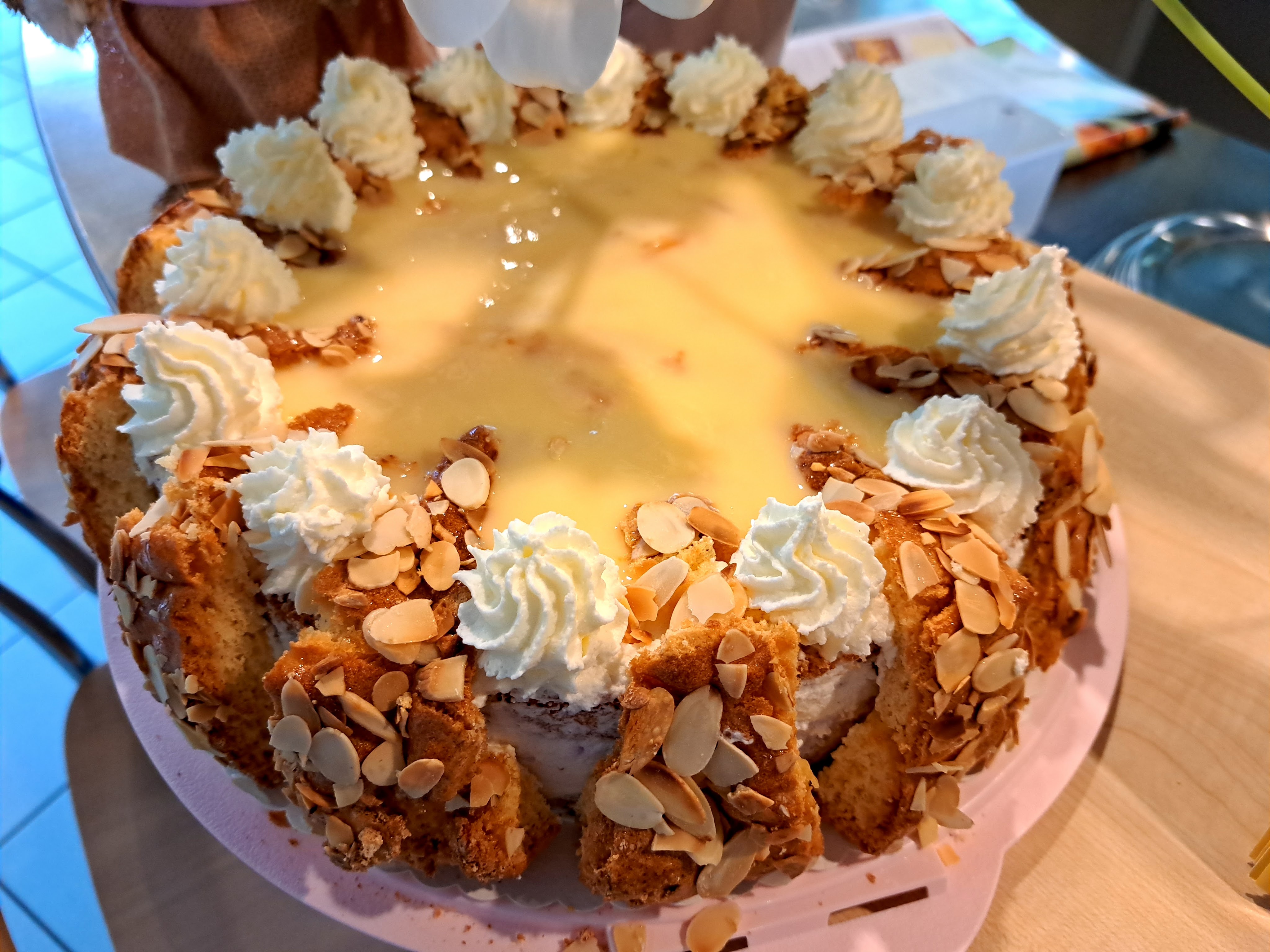 Тази празнична торта е много цветна и без използването на сладкарска боя за оцветяване. Кремът е оцветен от вкусния конфитюр от боровинки, а жълтата глазура е от яйчен ликьор.