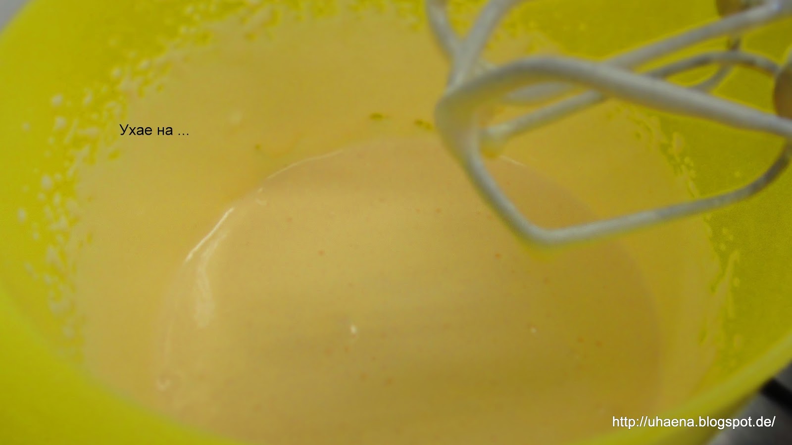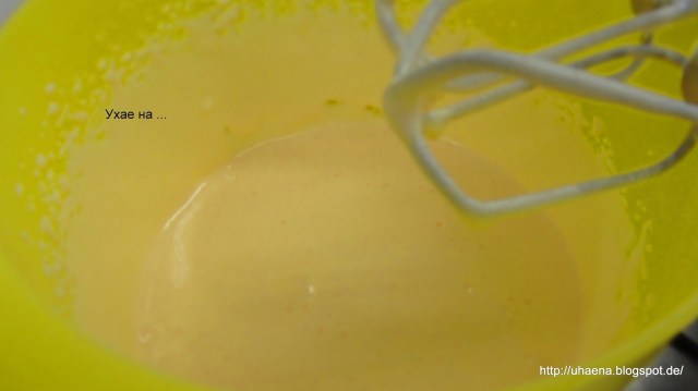 - В друга купа смесвам жълтъците, водата, захарта и ваниловата захар. Разбивам всичко пак за около пет минути с помощта на миксера. Сместа е готова, когато промени цвета си от жълта в почти бяла и получи пухкава консистенция.