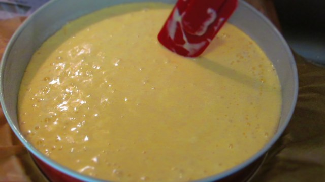 - Изсипвам сместа в подготвената форма и винаги се опитвам да не го изравнявам, а да избутам от средата към краищата. По-скоро в средата да е малко по-ниско с около половин сантиметър от краищата. Това го правя с цел по време на печенето да не ми се получава блатът като купол или в средата да е по-висок, отколкото в краищата.