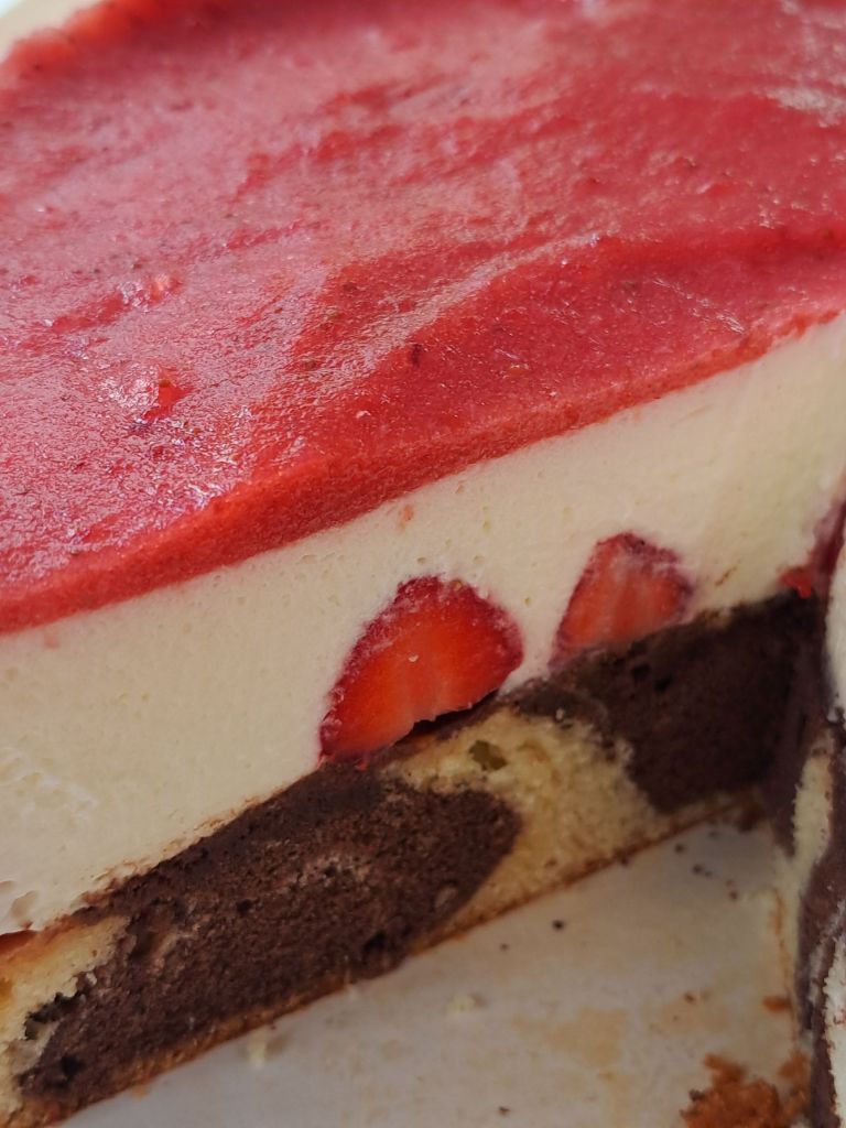- През това време пюрирам леко размразените ягоди, заедно с конфитюра и двете пакетчета желатинов фикс. Изсипвам върху охладената торта и оставям за поне 3 часа или цяла нощ да стегне.